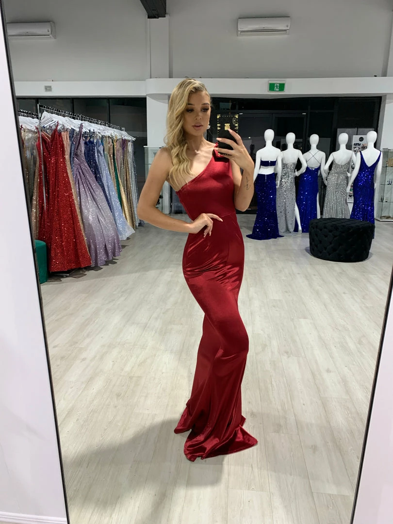 This gorgeous Honey Couture ALEXIS Burgundy Silky Frilly One Shoulder Mermaid Formal Dress is the most amazing Gown!Â