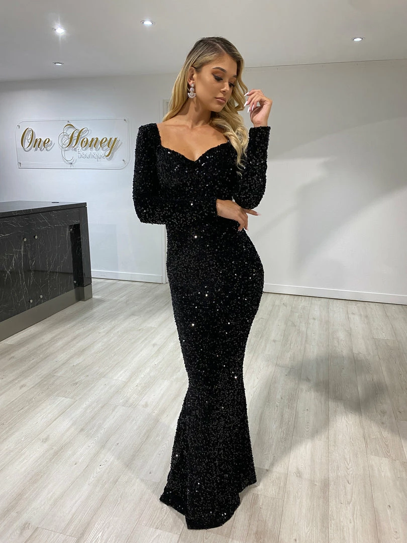 This gorgeous Honey Couture ALISON Black Sequin Long Sleeve Formal Dress is the most amazing Gown! Pair with high heels and earrings and you are good to go!