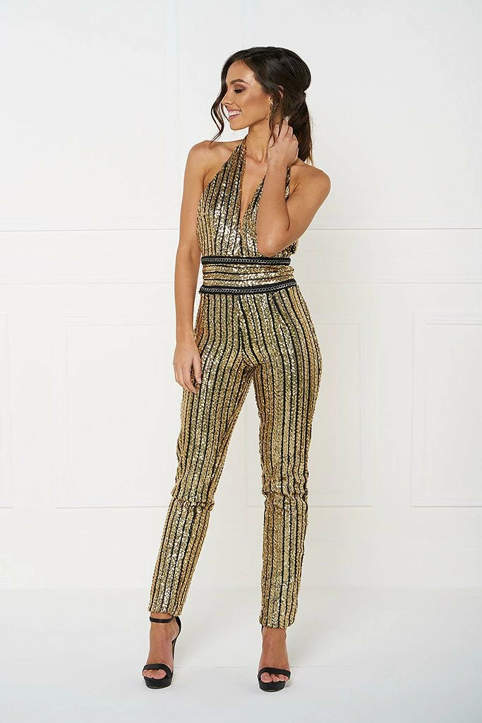 This Sexy V-Neck Halterneck Black and Gold Sequin Jumpsuit is a head turning style featuring, panels embellished with chain and rope. Pair with a simple pair of heels for your next special occasion.