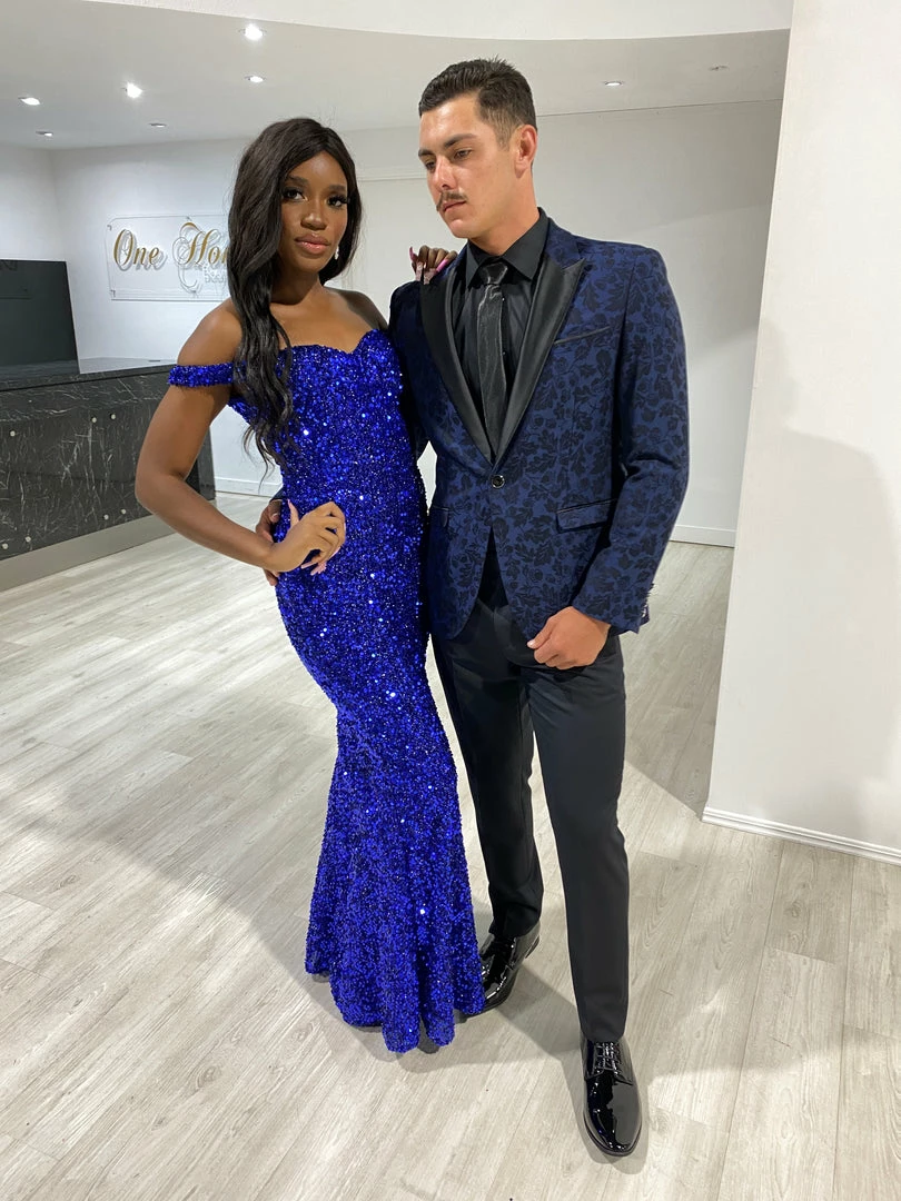 This gorgeous Honey Couture BLAIR Electric Blue Sequin Off Shoulder Formal Gala Dress is the most amazing Gown! Pair with high heels and earrings and you are good to go!Â