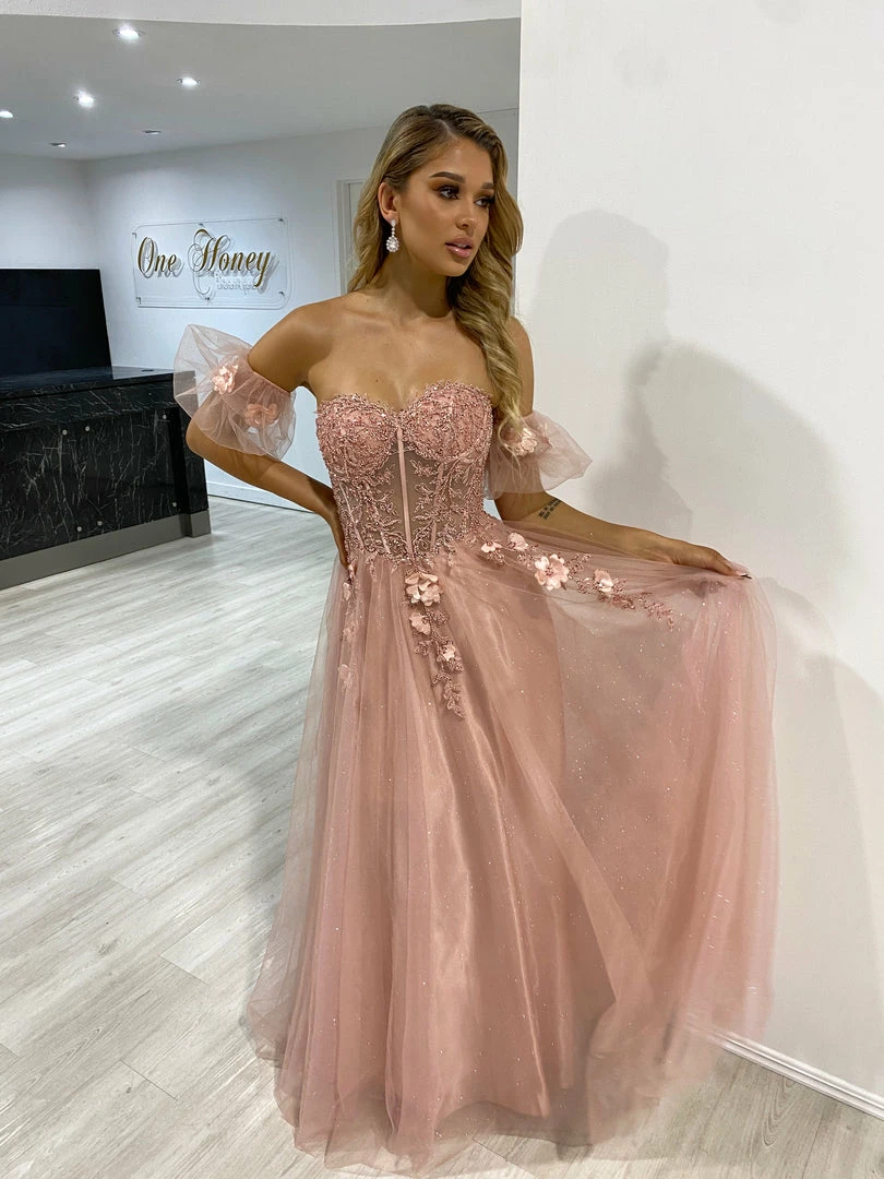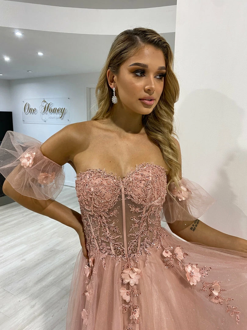 This gorgeous Honey Couture BLOOM Blush Pink Bustier Lace Applique Tulle Formal Dress is the most amazing Gown! Standout from the crowd in this show stopping design!