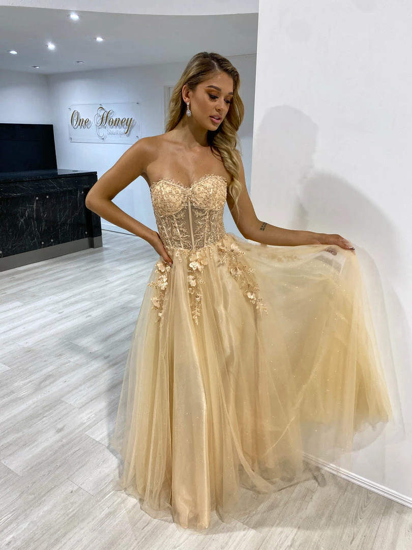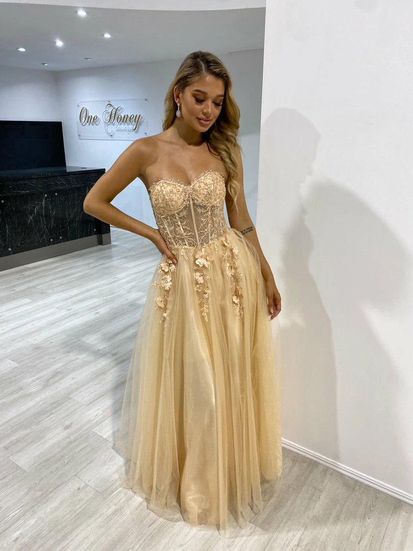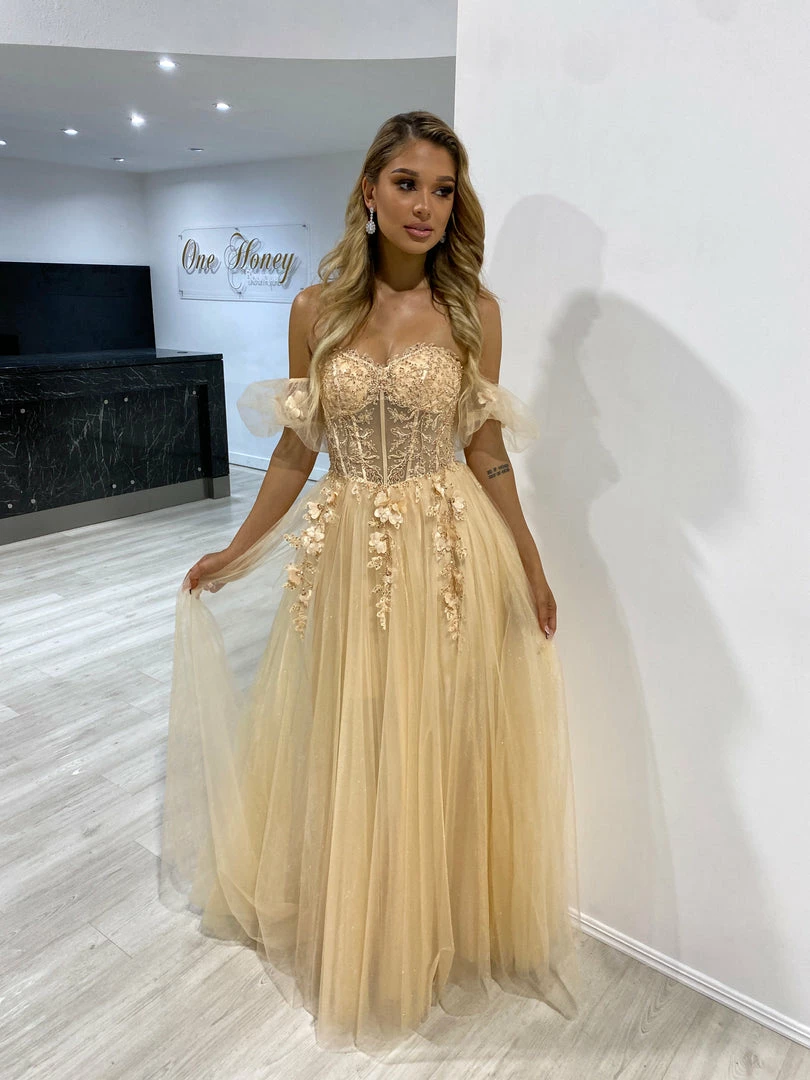 This gorgeous Honey Couture BLOOM Champagne Bustier Lace Applique Tulle Formal Dress is the most amazing Gown! Standout from the crowd in this show stopping design!