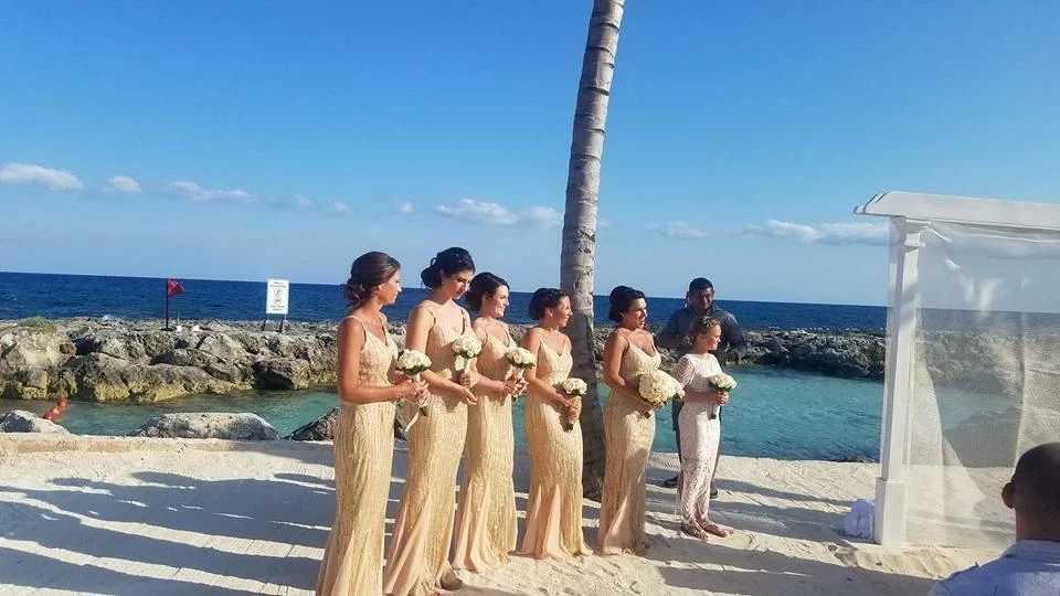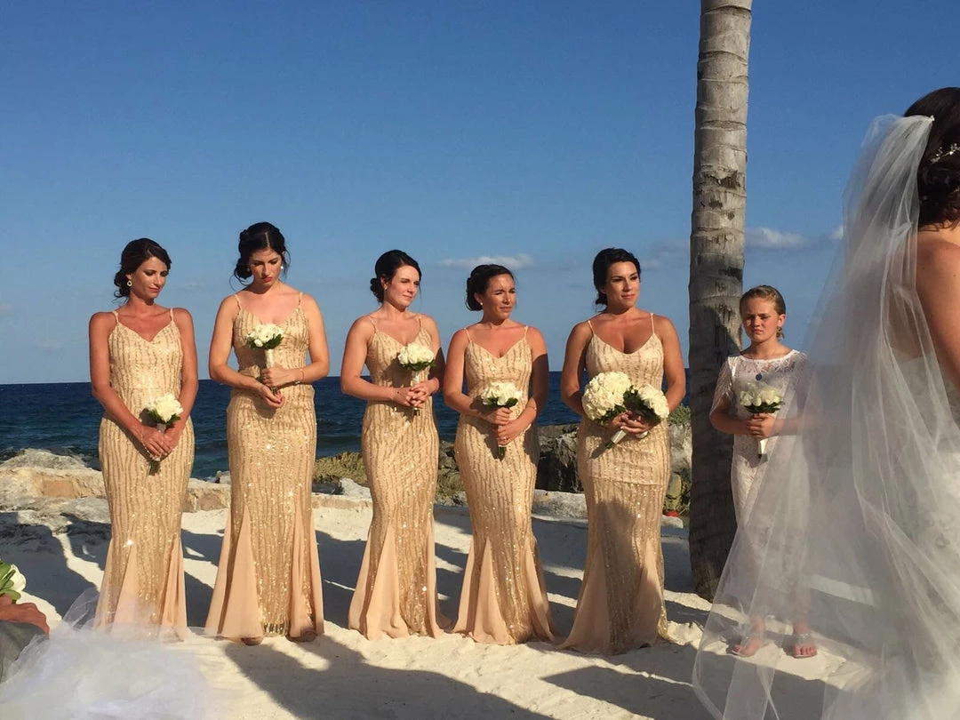 The unique style features sheer inserts to sophicated the gorgeous glitter fabric. The perfect Bridesmaid Gown