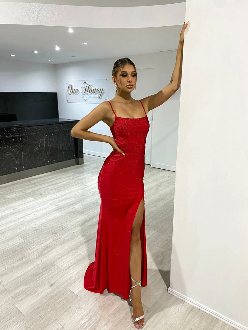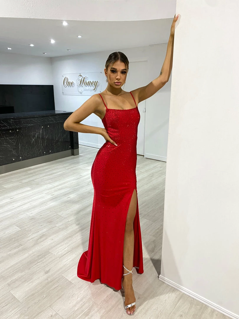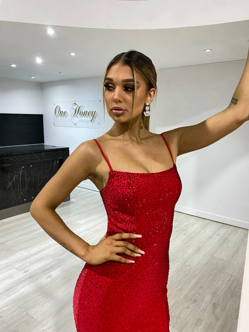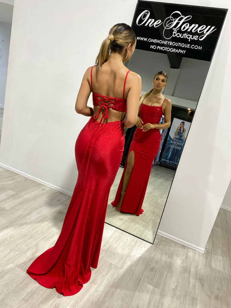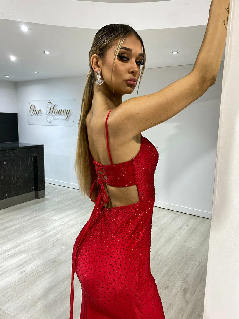 We are obsessed with the Honey Couture ELANAÂ Red Diamante Bustier Lace Up Formal Dress!!!Â