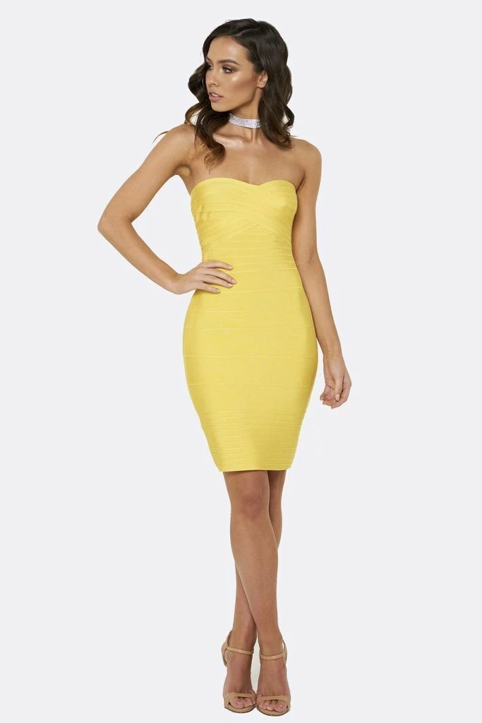 This Honey Couture Yellow Strapless Bandage Dress is perfect for any occasion, Pair with nude or gold heels, statement earrings and bracelet