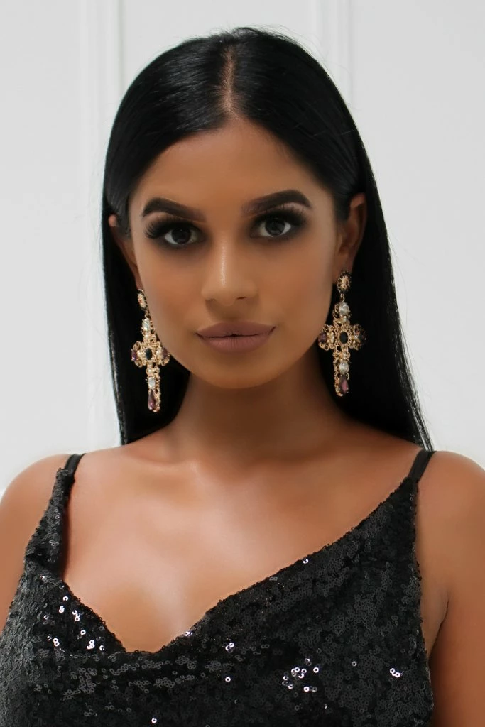 Be the first to review “Honey Couture Jewellery ACCESSORIES Honey Couture Purple & Gold Oversized Cross Statement Earrings” Cancel reply