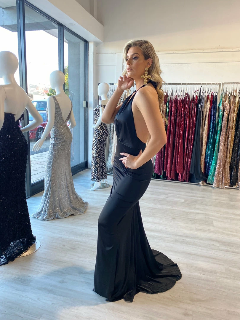 This gorgeous Honey Couture JODIE Black Halter Satin Mermaid Evening Gown Dress has just arrived!Â