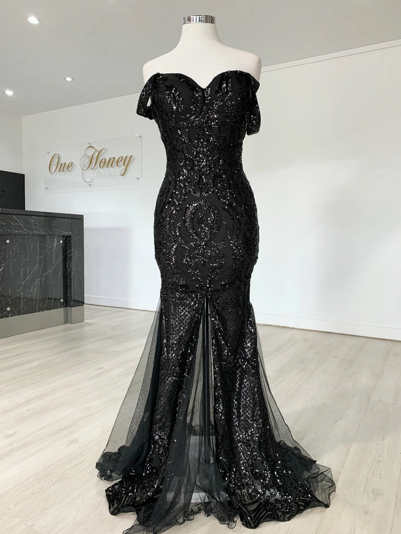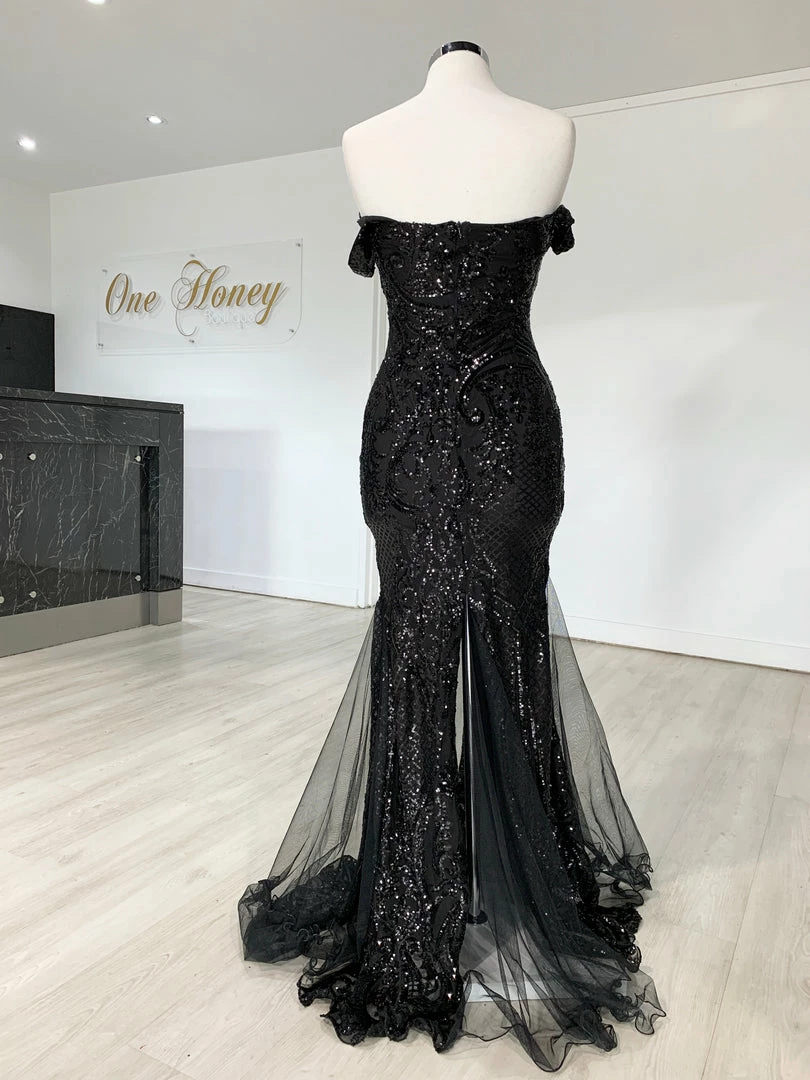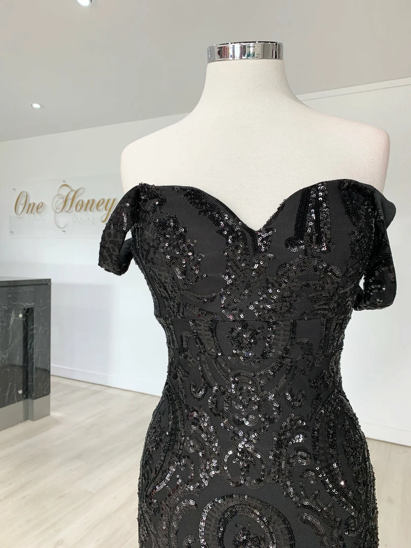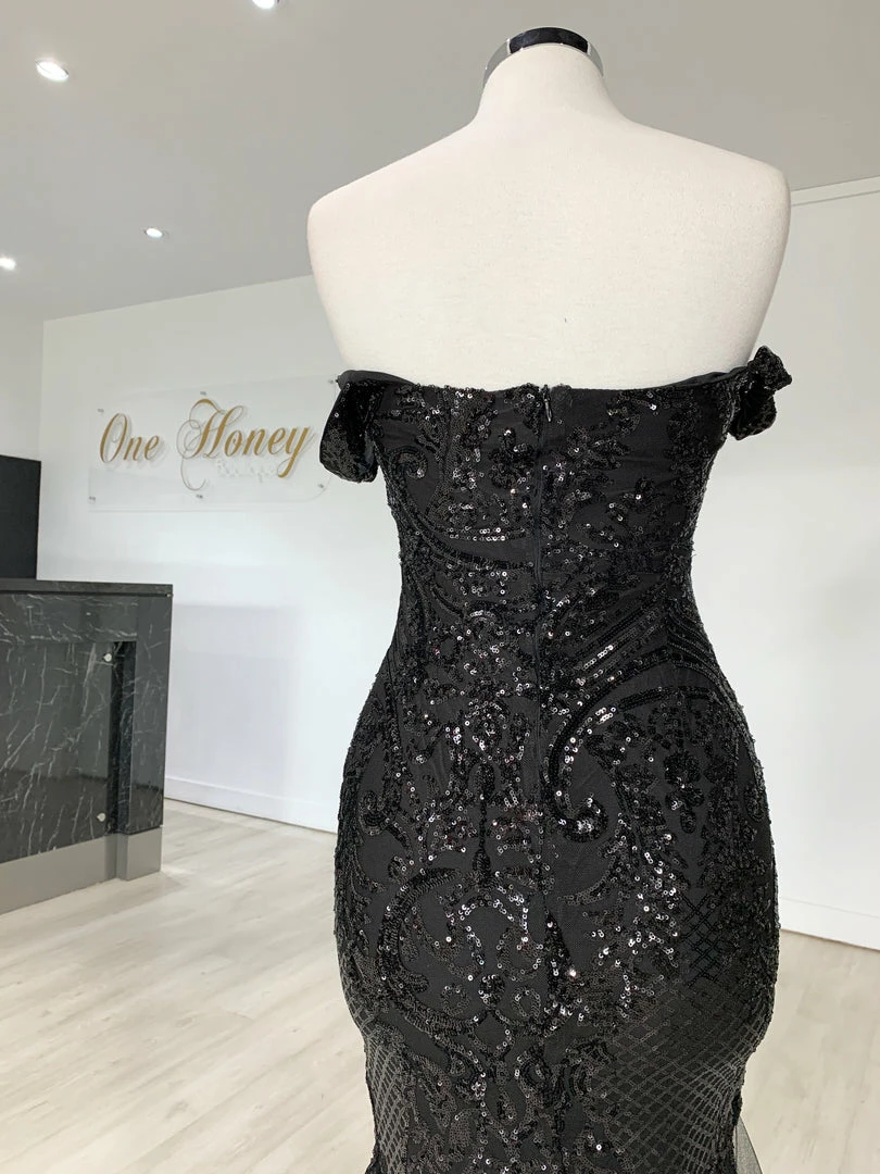 This gorgeous Honey Couture KIMBERLEY Black Sequin Off Shoulder Formal Dress is the most amazing Gown! Pair with high heels and a lipstick and you are good to go!Â