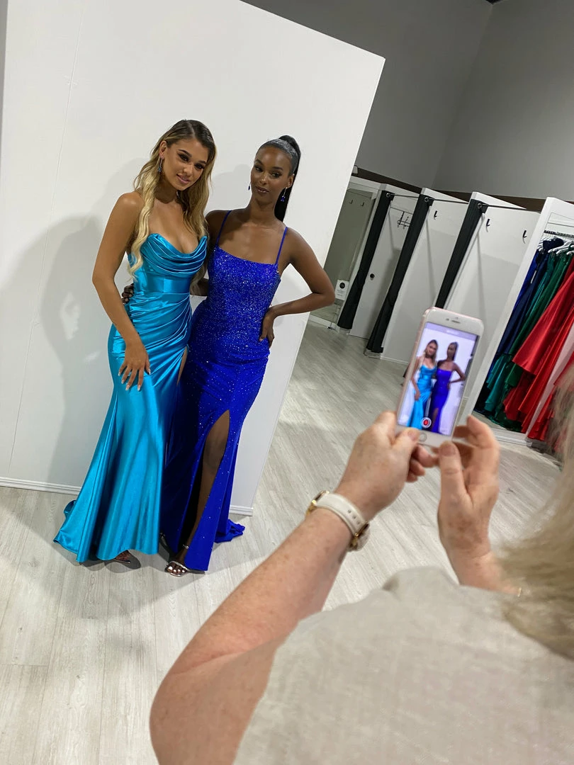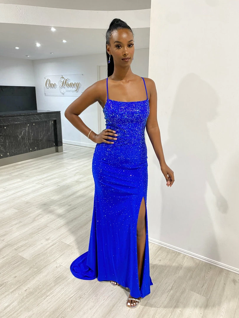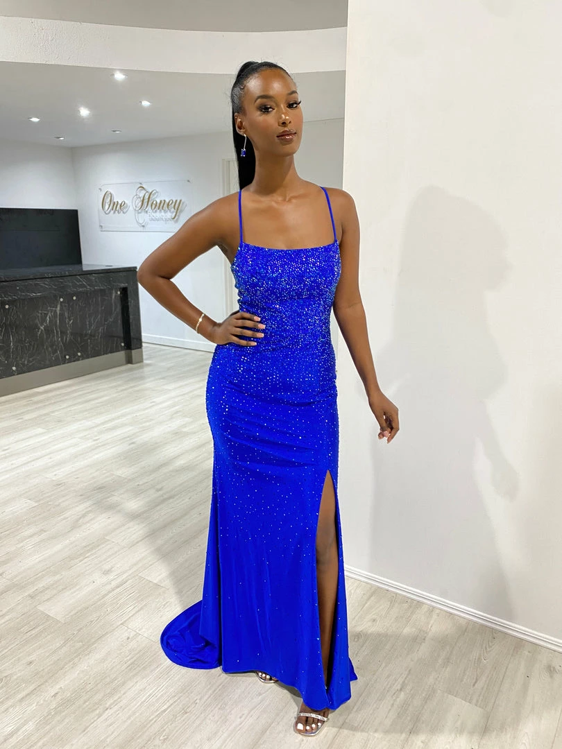 This gorgeous Honey Couture Honey Couture LEONIE Royal Blue Diamante Leg Split Mermaid Formal Dress is the most amazing Gown! Standout from the crowd in this show stopping design!