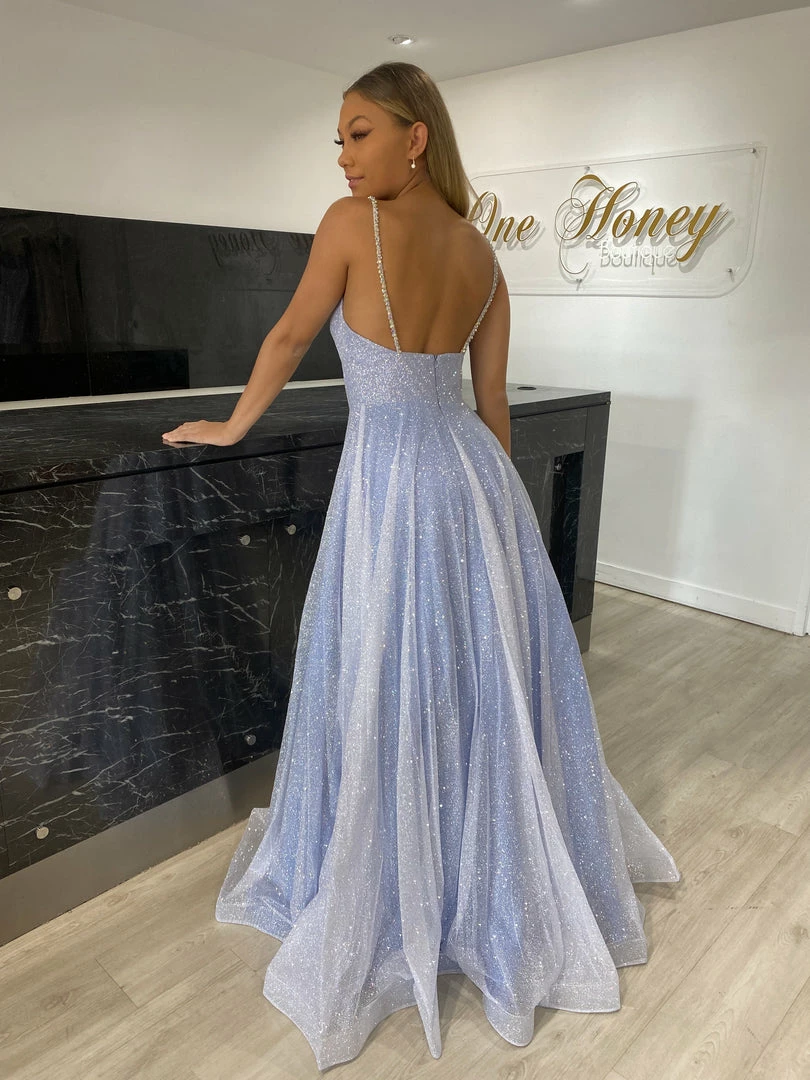 This gorgeous Honey Couture Honey Couture LIVIA Baby Blue Silver Glitter Ball Gown Formal Dress is the most amazing Gown! Standout from the crowd in this show stopping design!