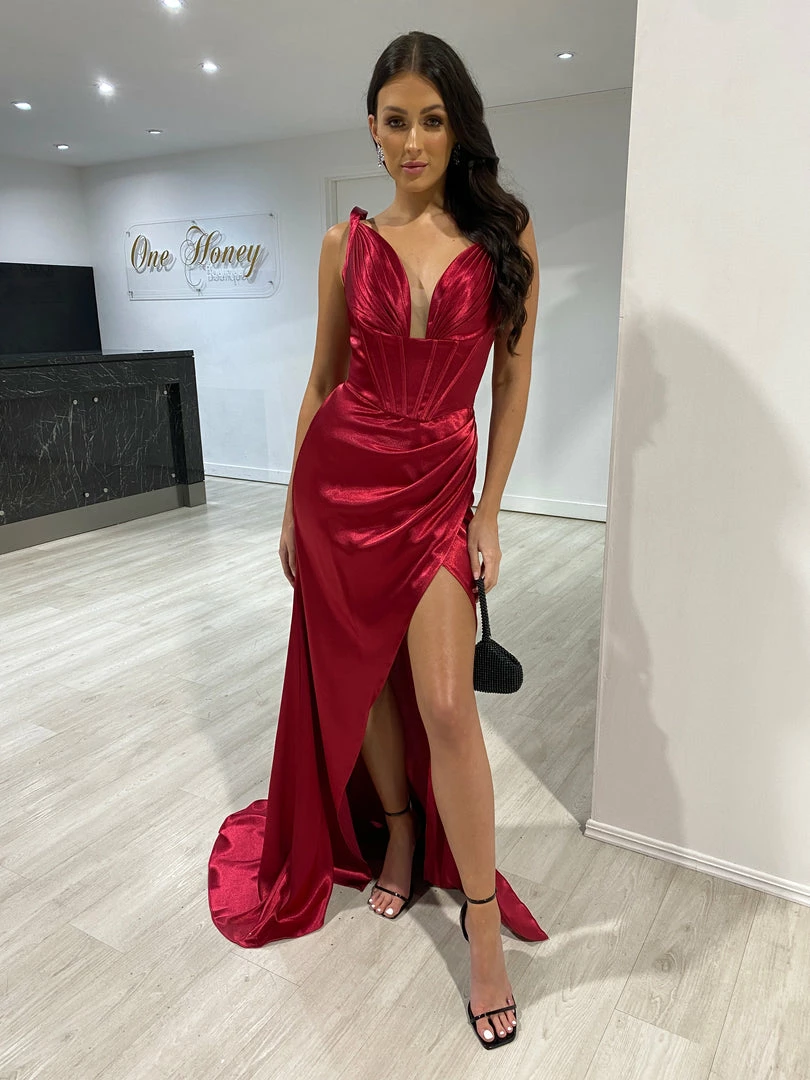 This gorgeous Honey Couture SASHA Burgundy Satin Corset Leg Split Formal Dress is the most amazing Gown! Standout from the crowd in this show stopping design!