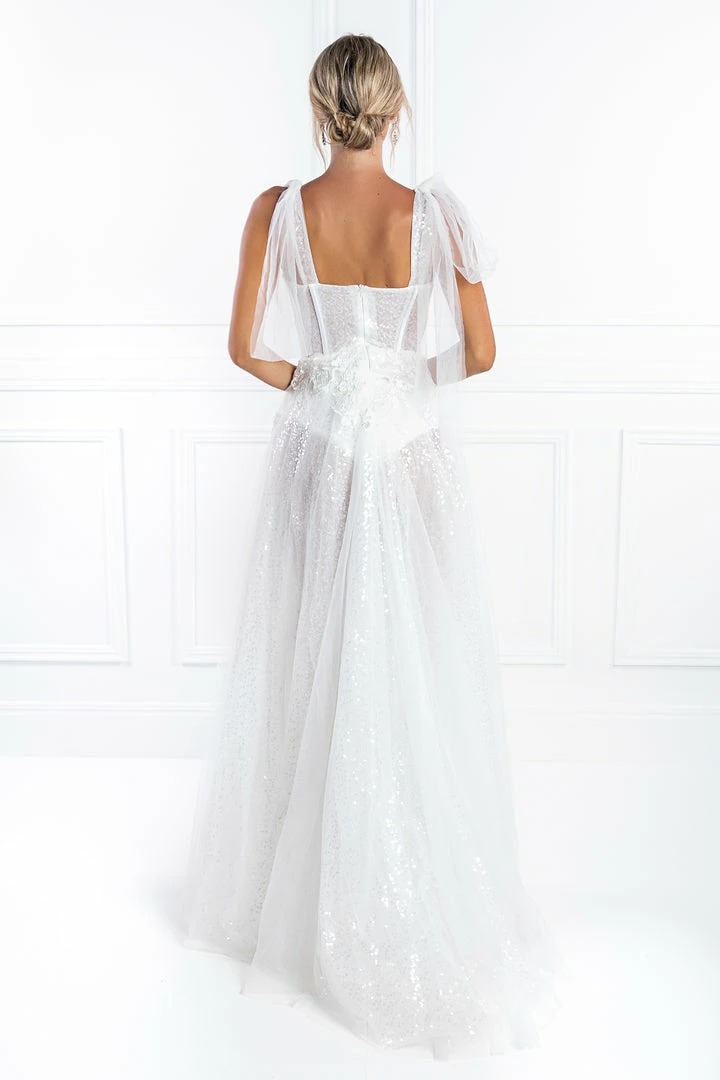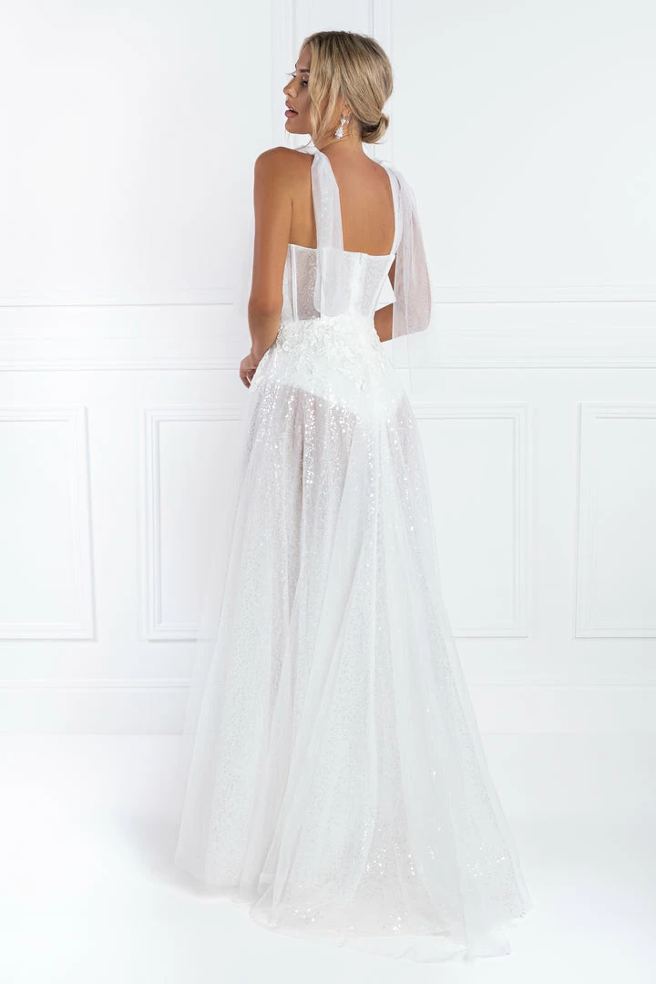 This gorgeous Honey Couture APRIL White Tulle Glitter Bodysuit Formal Dress or Wedding/Engagement Dress.Â