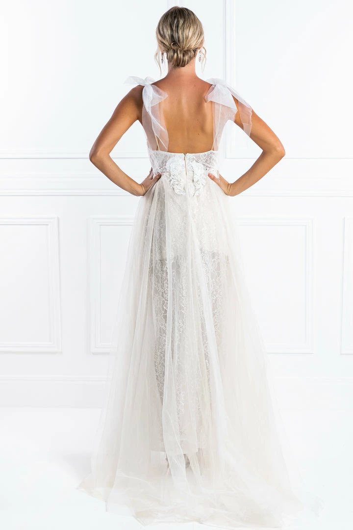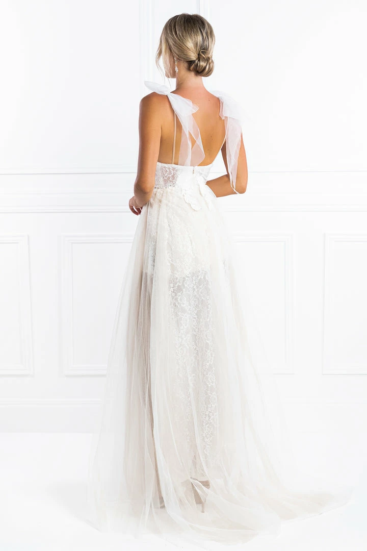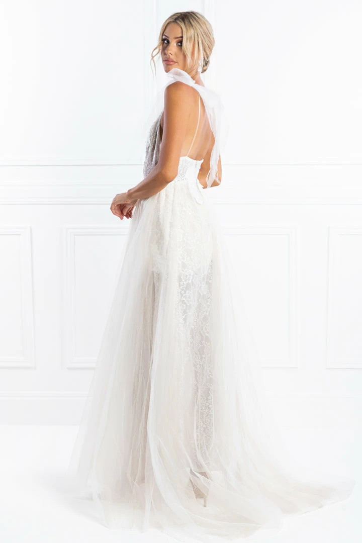 This gorgeous Honey Couture PEARLA White Tulle Bodysuit Formal Dress or Wedding/Engagement Dress.Â
