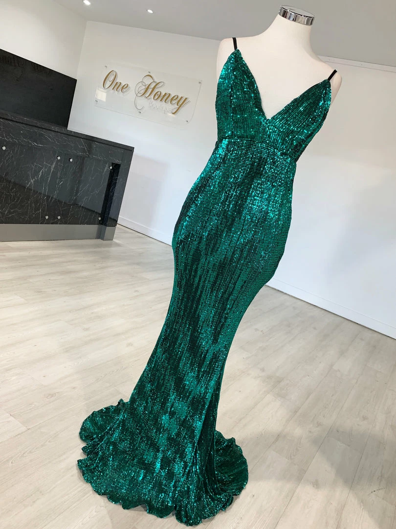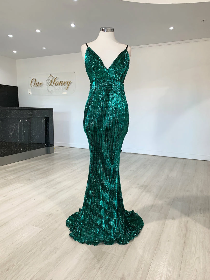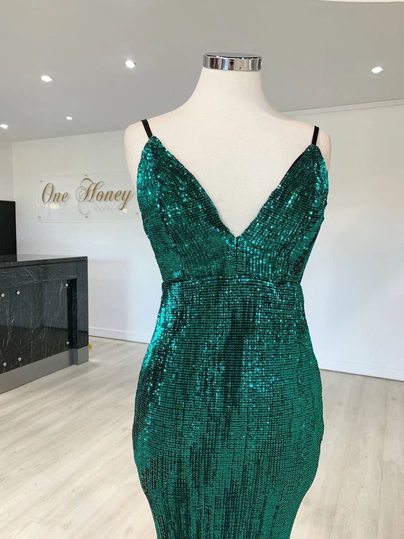 This gorgeous Honey Couture ROSALIE Green Black Low Back Sequin Formal Gown Dress is the most amazing Gown! It features a mermaid train. Pair with high heels and a lipstick and you are good to go!Â