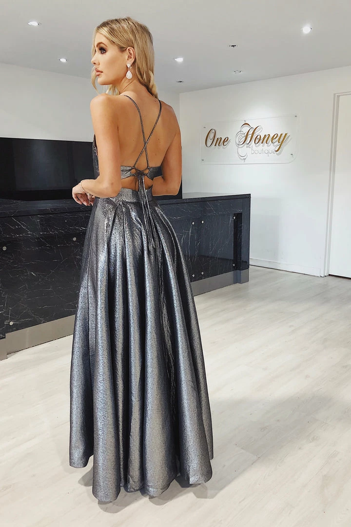 We are obsessed with the Honey Couture TAZMIN Gunmetal Metallic Silver Formal Gown perfect for Formal Occasions.