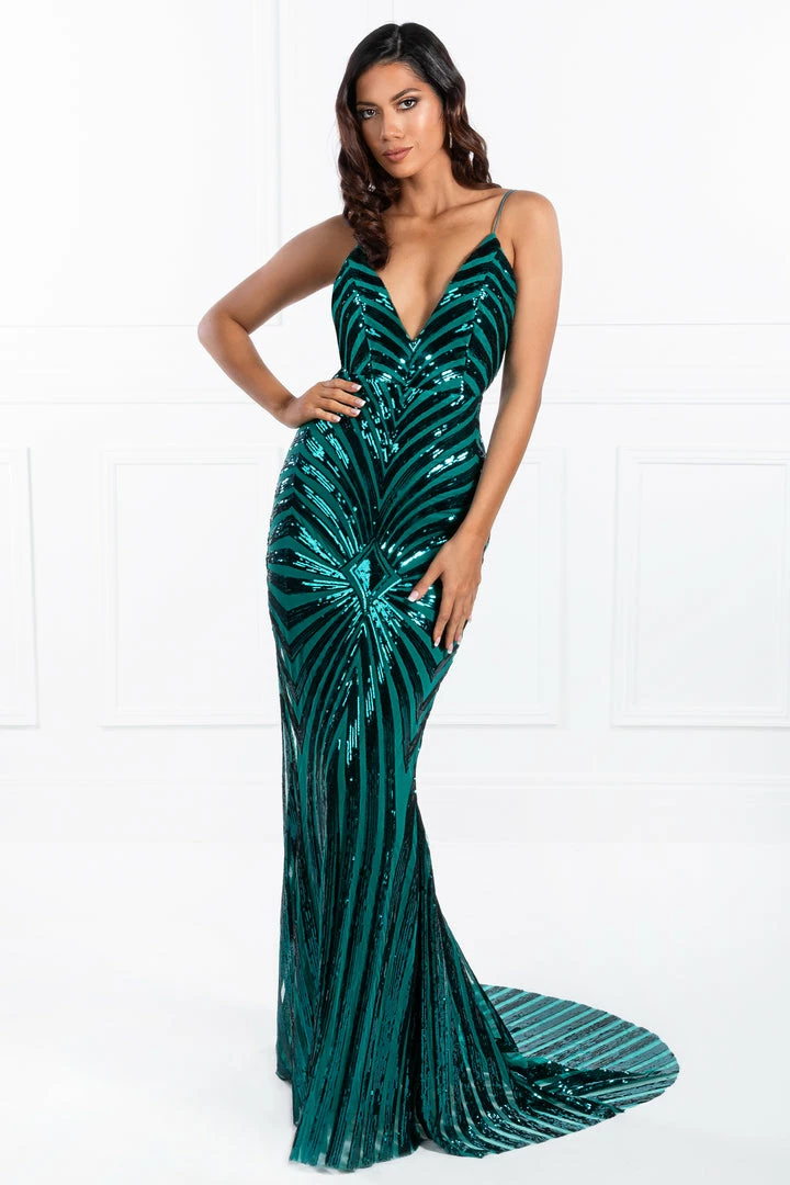 This gorgeous Honey Couture TILDA Emerald Green Low Back Sequin Formal Gown Dress is the most amazing Gown! It features a long mermaid train. Pair with high heels and a lipstick and you are good to go!Â