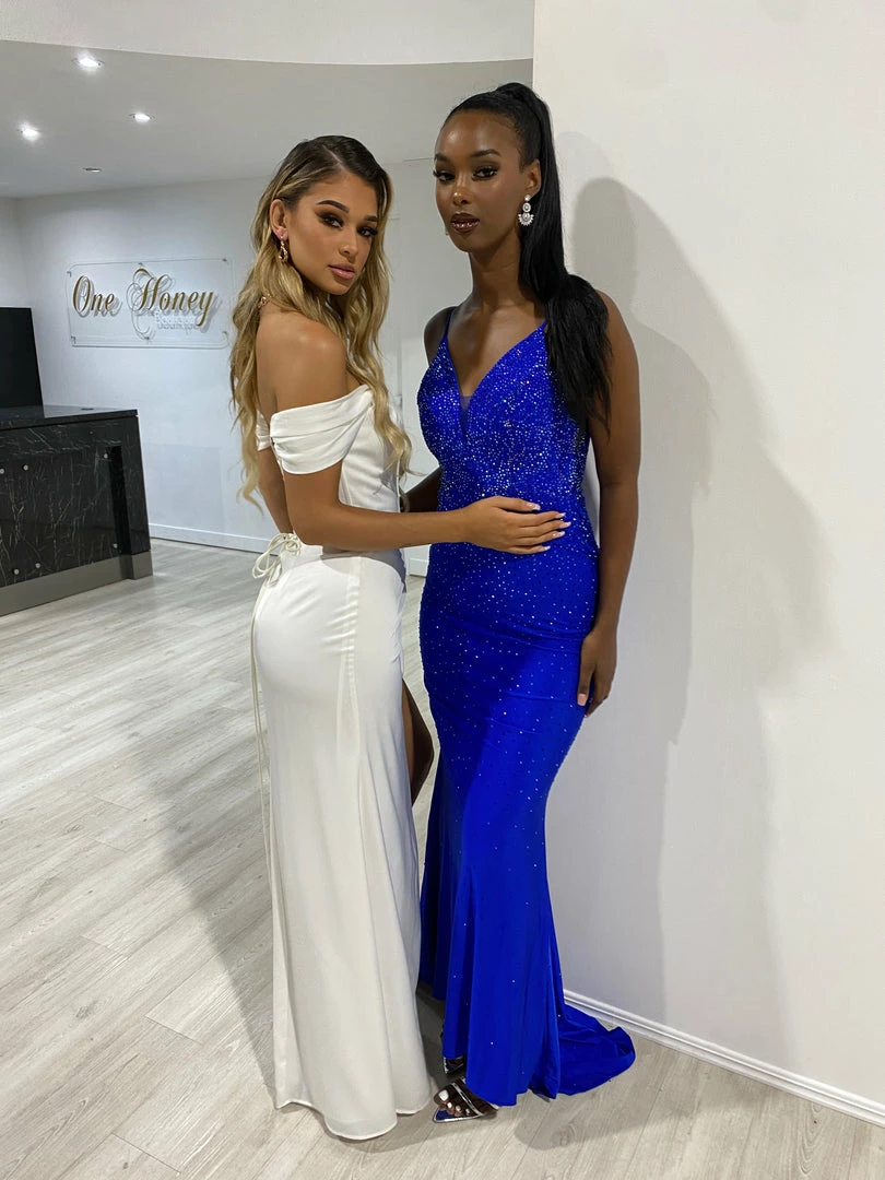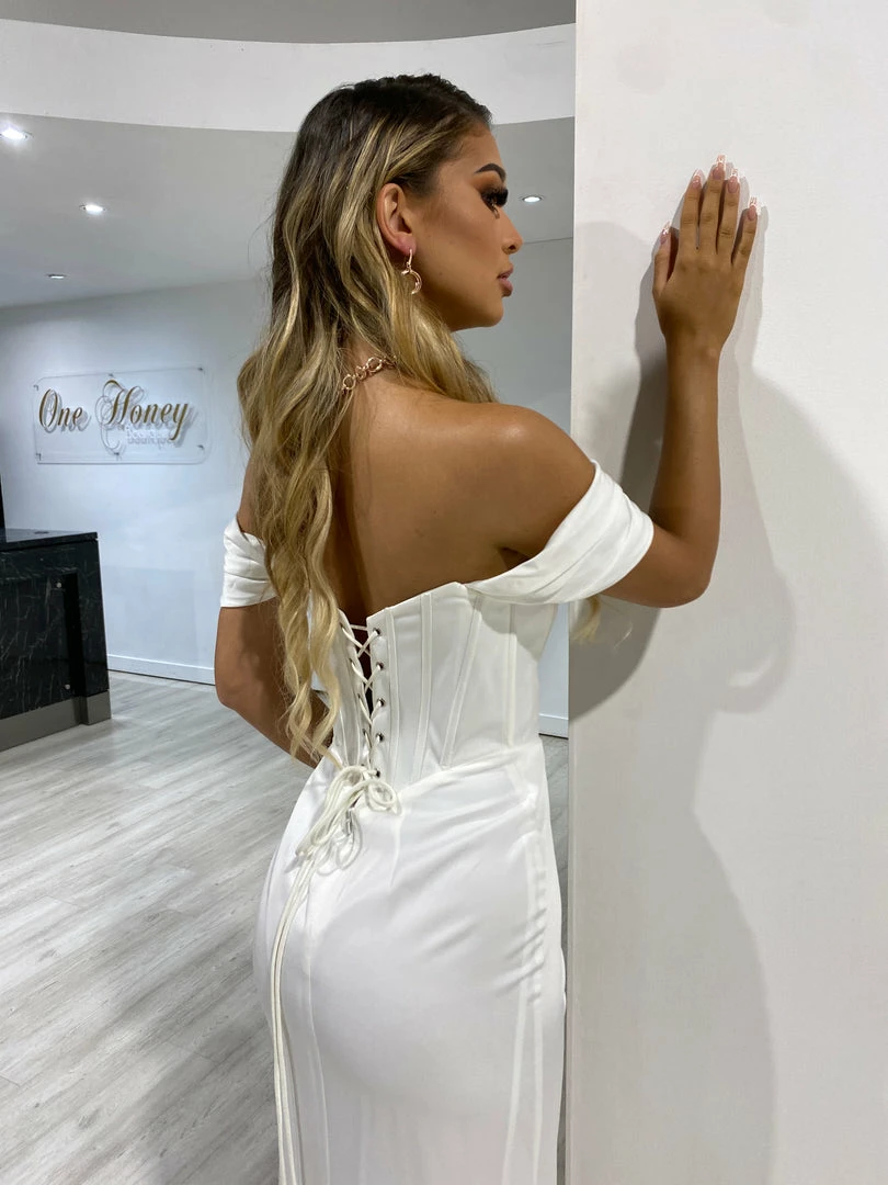 This gorgeous Honey Couture TYRA Off White Corset Bustier Leg Split Formal Dress is the most amazing Gown! Standout from the crowd in this show stopping design!