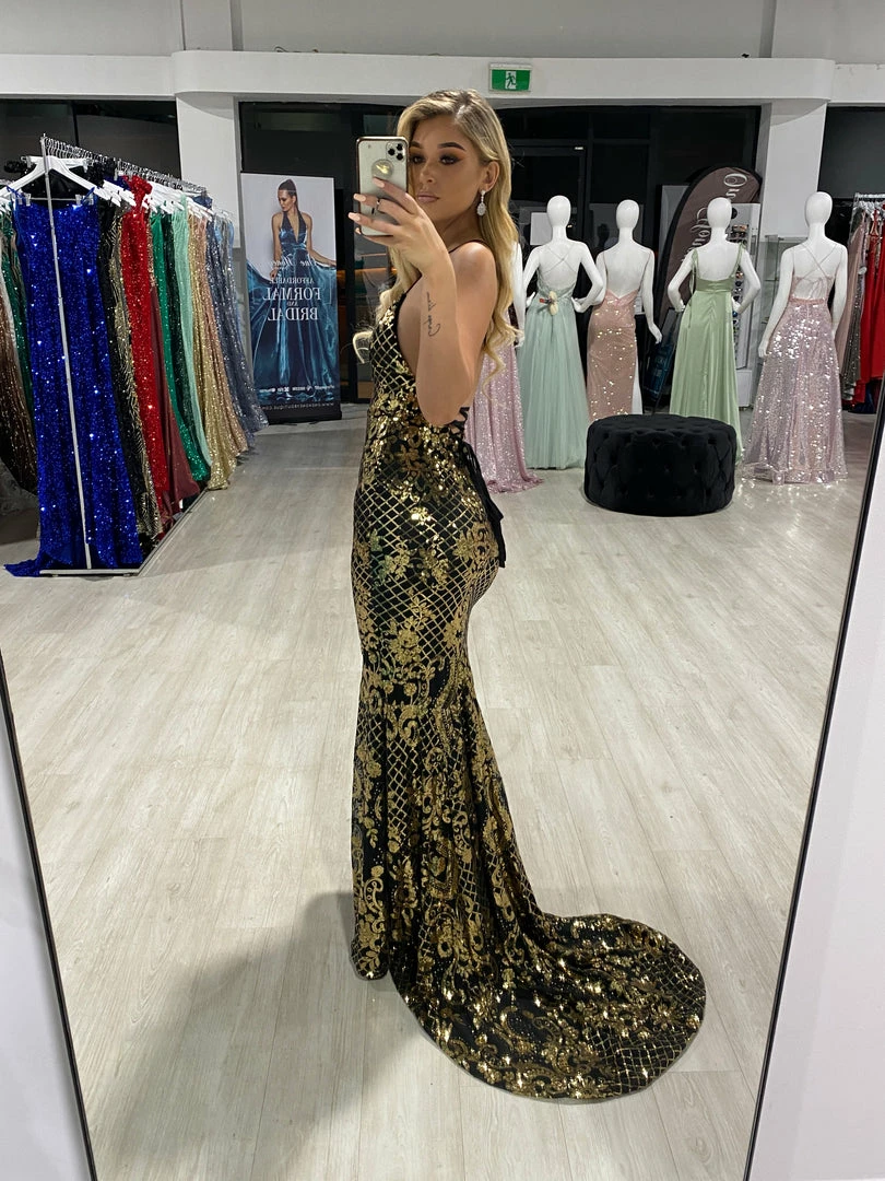 This gorgeous Honey Couture VIXEN Black & Gold Low Back Mermaid Glitter Formal Dress is the most amazing Gown!Â