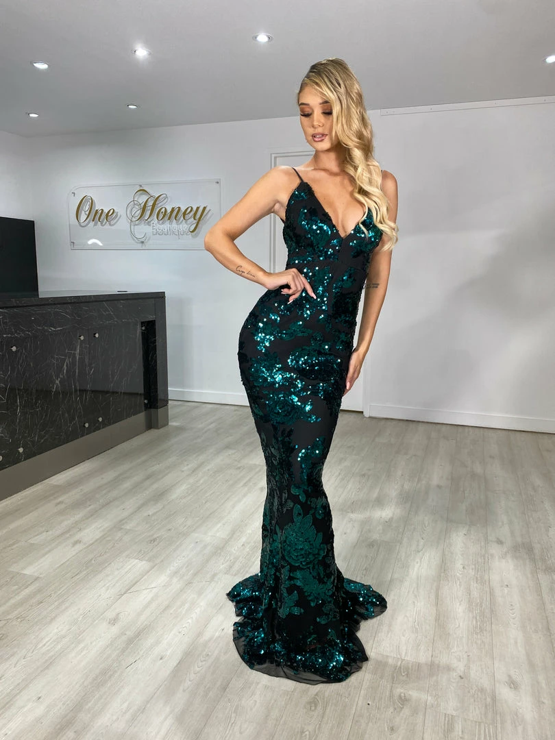 This gorgeous Honey Couture ZARA Emerald Green & Black Sequin Low Back Mermaid Formal Dress is the most amazing Gown!Â
