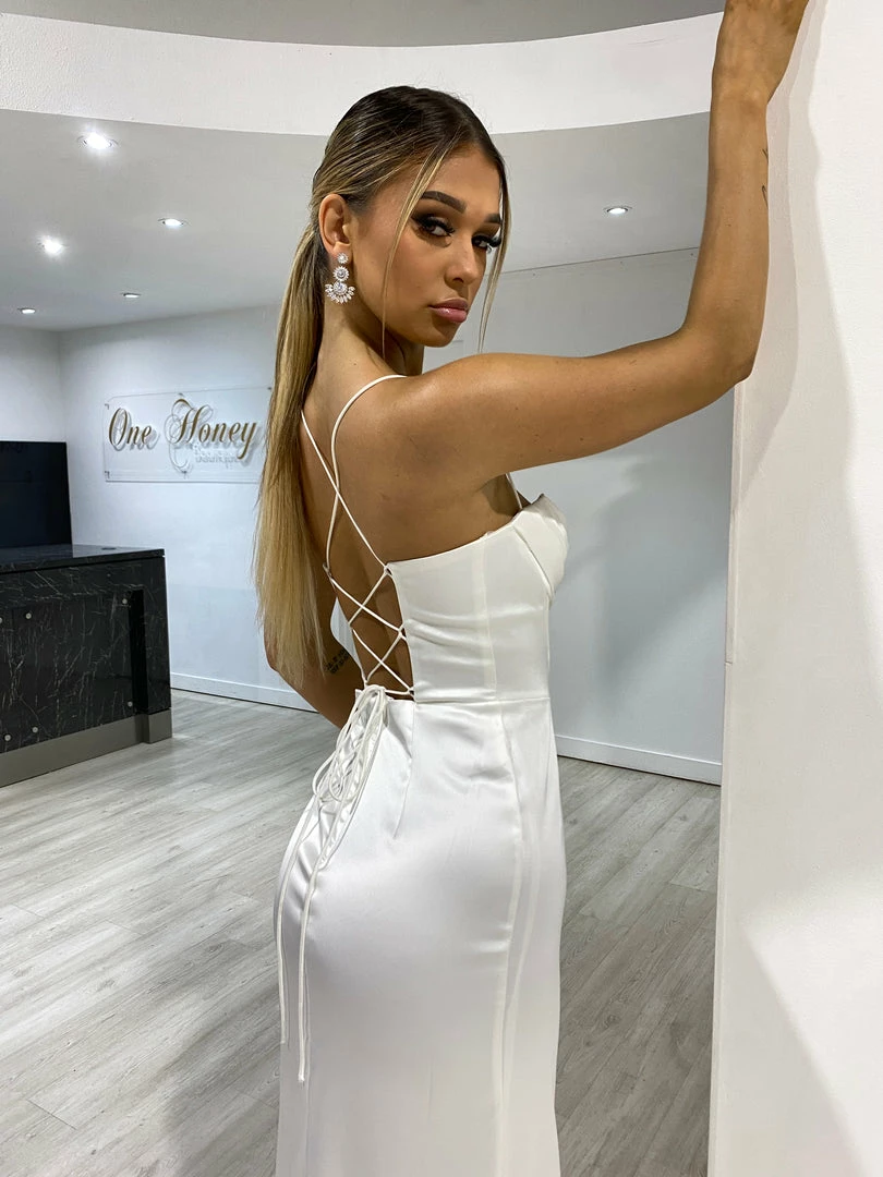 This gorgeous Honey Couture ZENDAYA Off White Satin Corset Bustier Leg Split Formal Dress is the most amazing Gown! Standout from the crowd in this show stopping design!