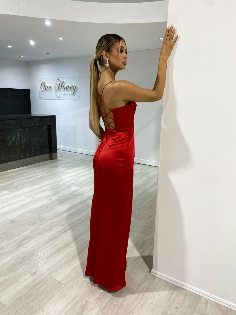 This gorgeous Honey Couture ZENDAYA Red Satin Corset Bustier Leg Split Formal Dress is the most amazing Gown! Standout from the crowd in this show stopping design!