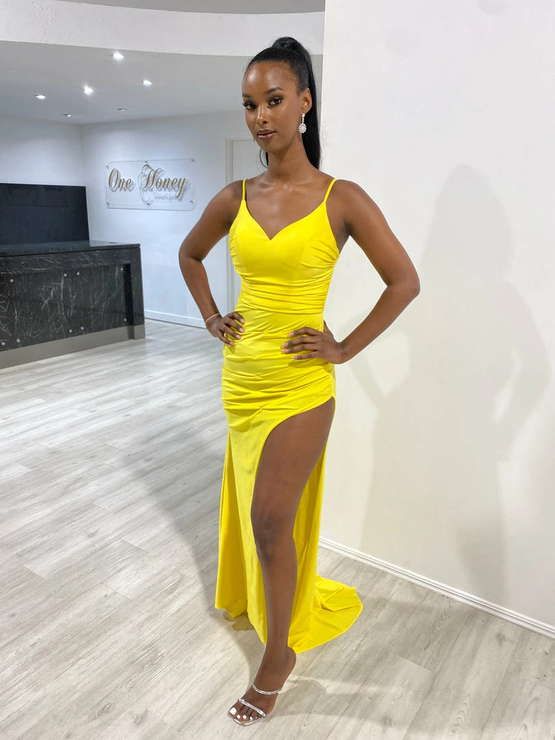 We are obsessed with the Honey Couture ZURI Neon Yellow Corset Ruched Formal Gown Dress!!!Â