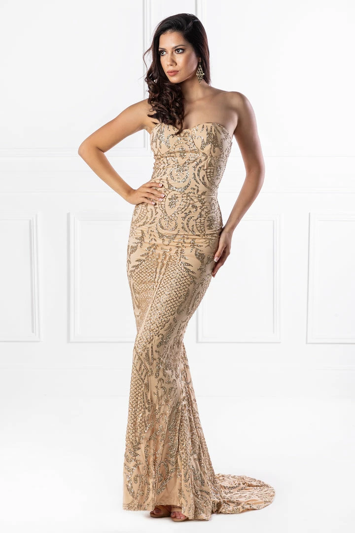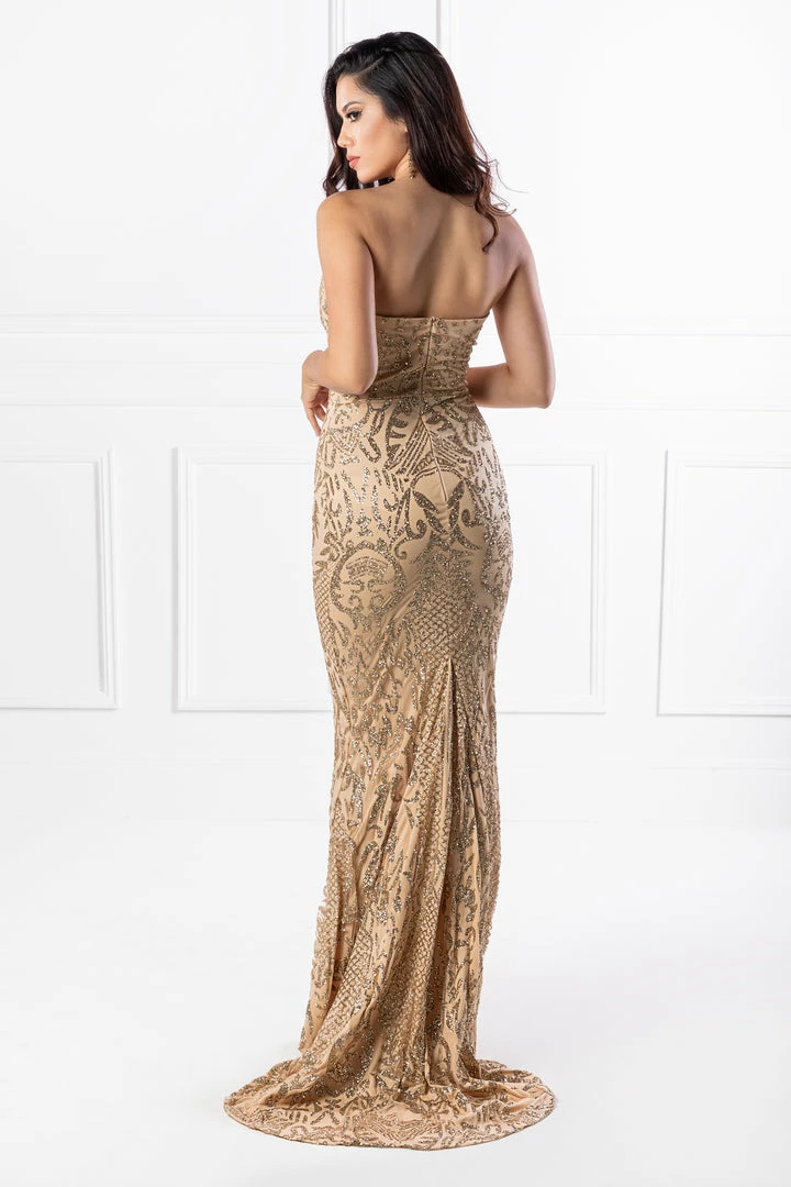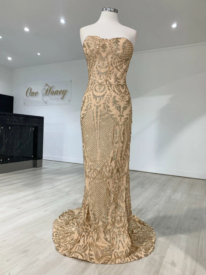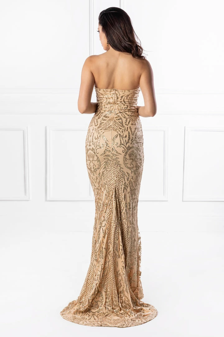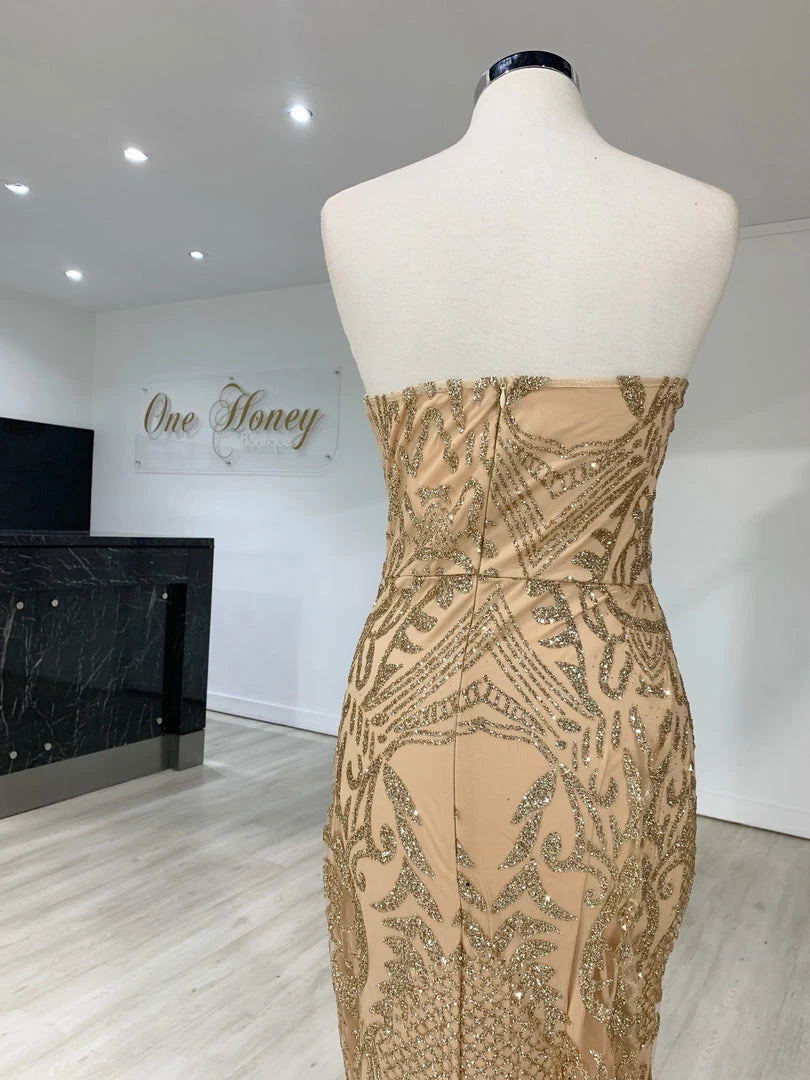 NEW ARRIVALS Honey Couture ALIZEY Gold Glitter Snakeskin Strapless Formal Gown Dress