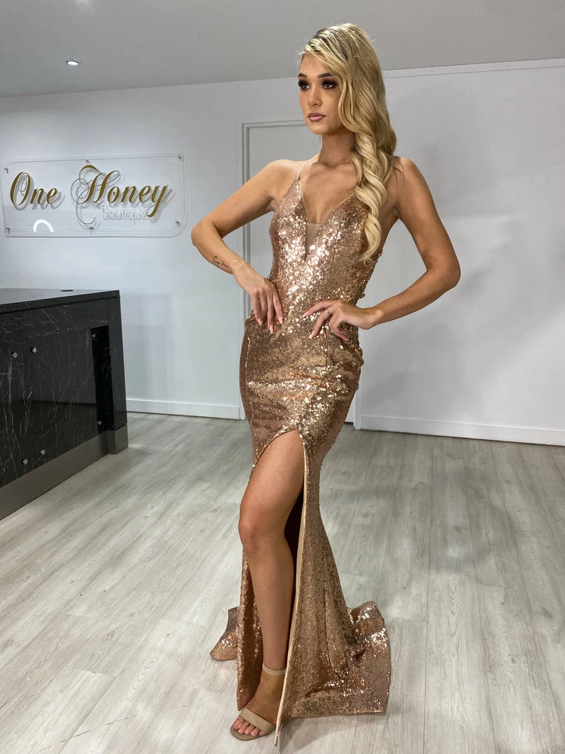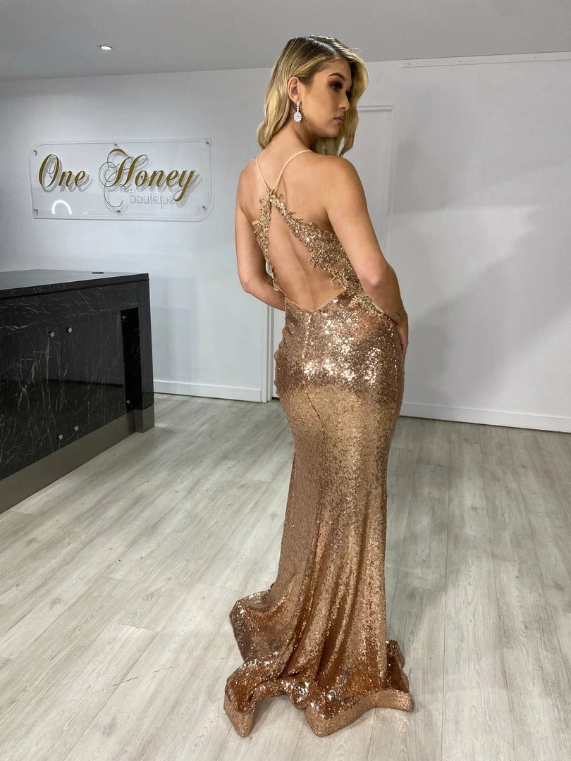 This gorgeous Honey Couture ASHLEY Gold Sequin w Lace Low Back Mermaid Formal Dress is the most amazing Gown! Standout from the crowd in this show stopping design!