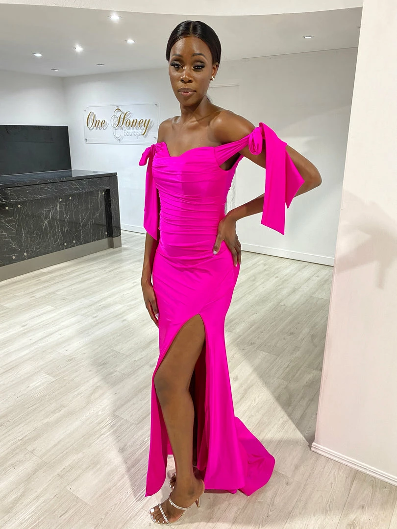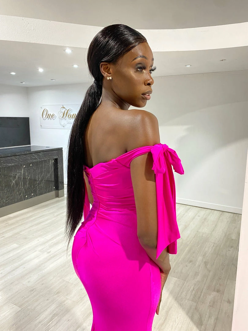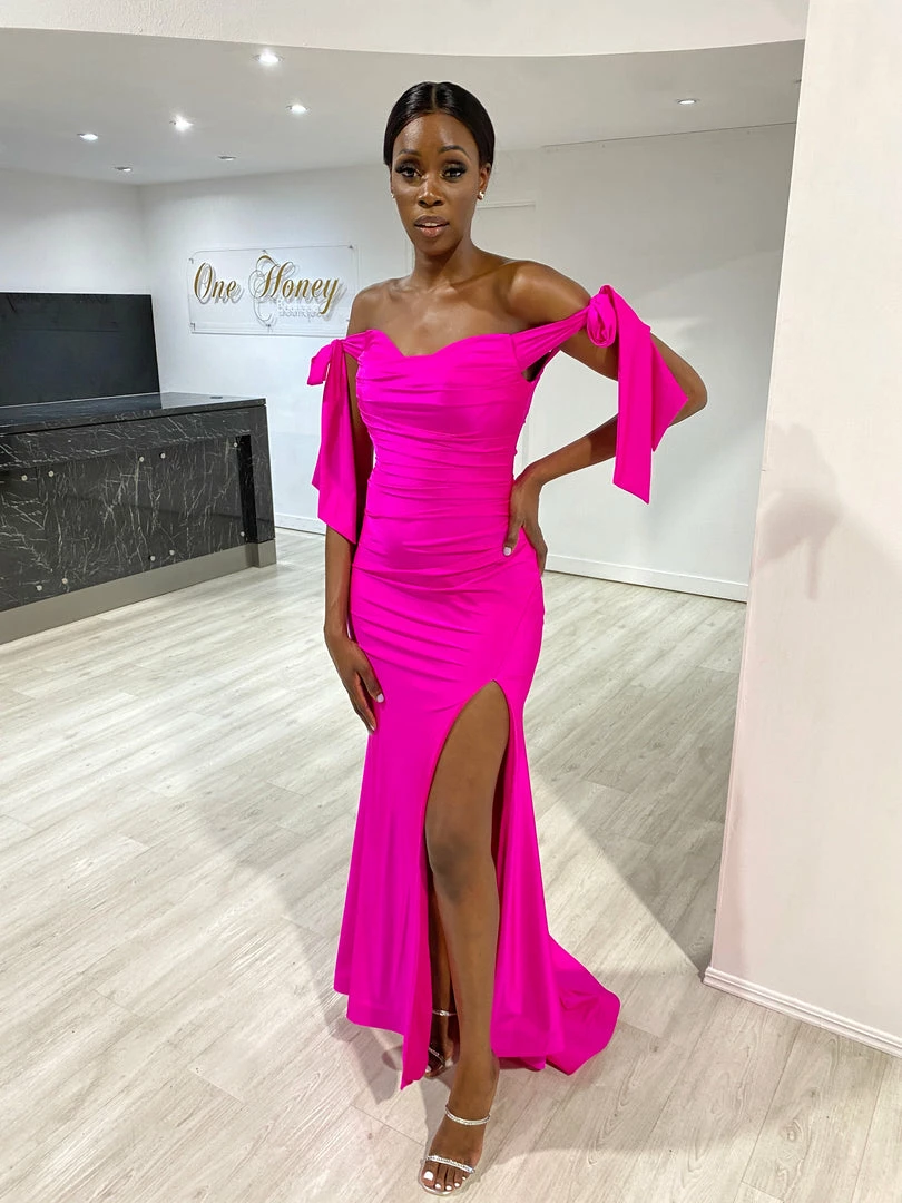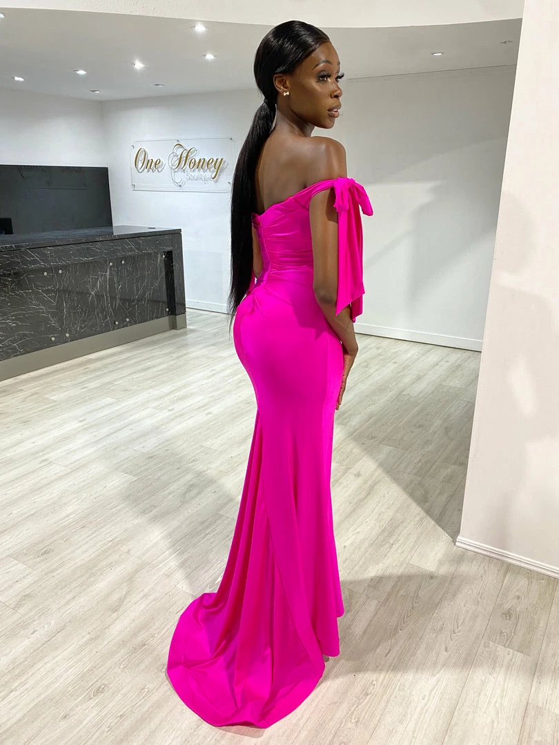 This gorgeous Honey Couture BELLE Fuchsia Hot Pink Off Shoulder Mermaid Formal Dress is the most amazing Gown! Standout from the crowd in this show stopping design!