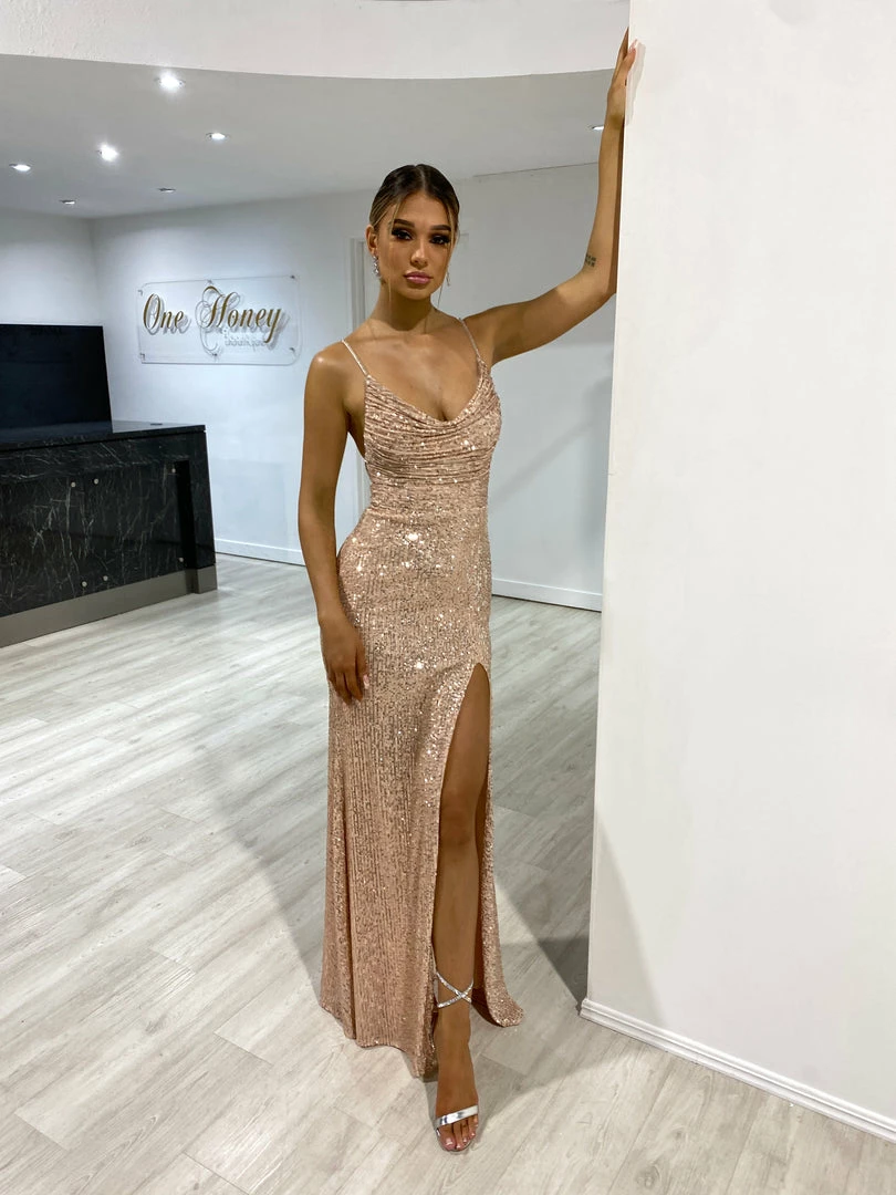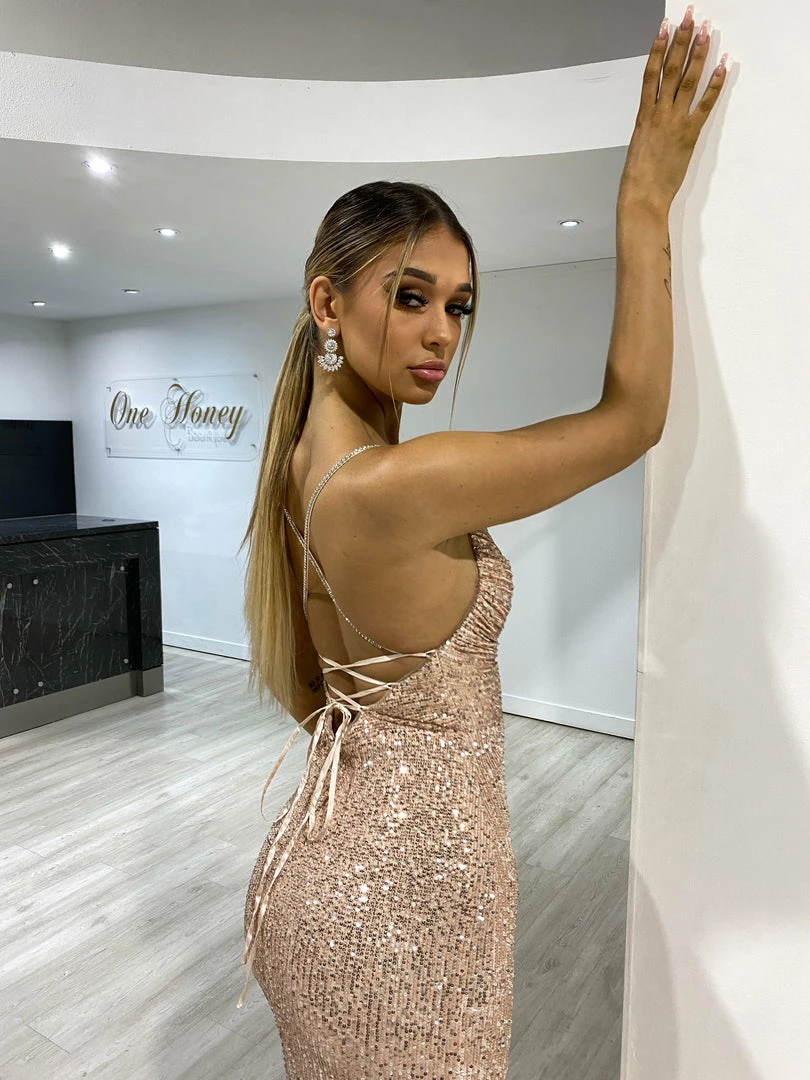 This gorgeous Honey Couture CELESTE Rose Gold Sequin Lace Up Formal Dress is the most amazing Gown! Pair with high heels and a lipstick and you are good to go!Â
