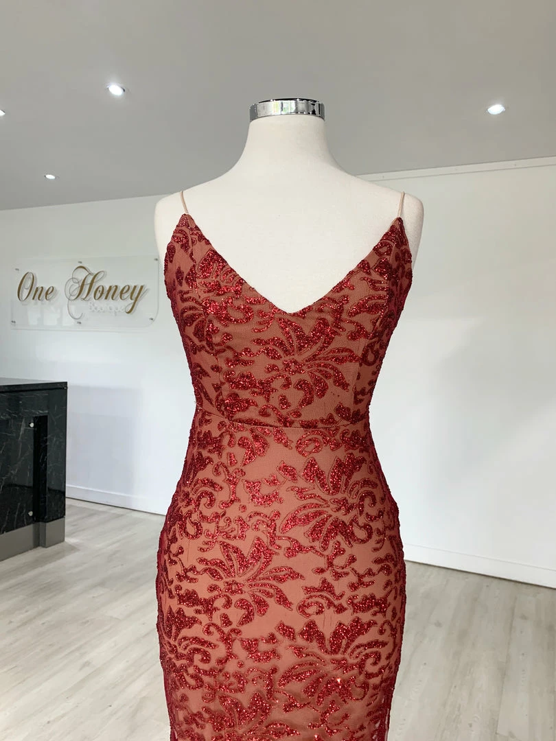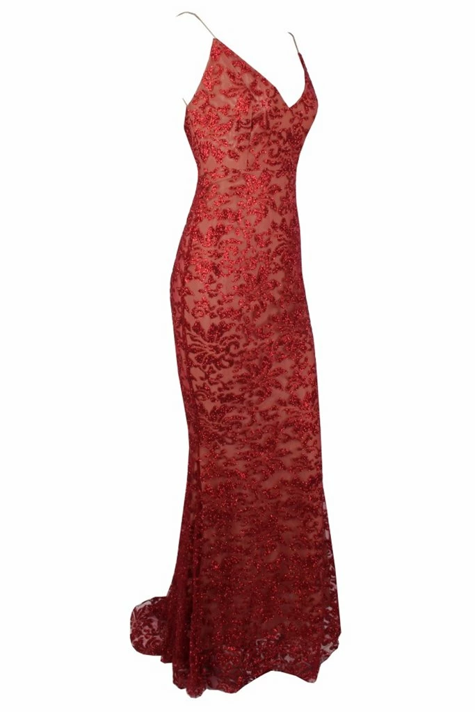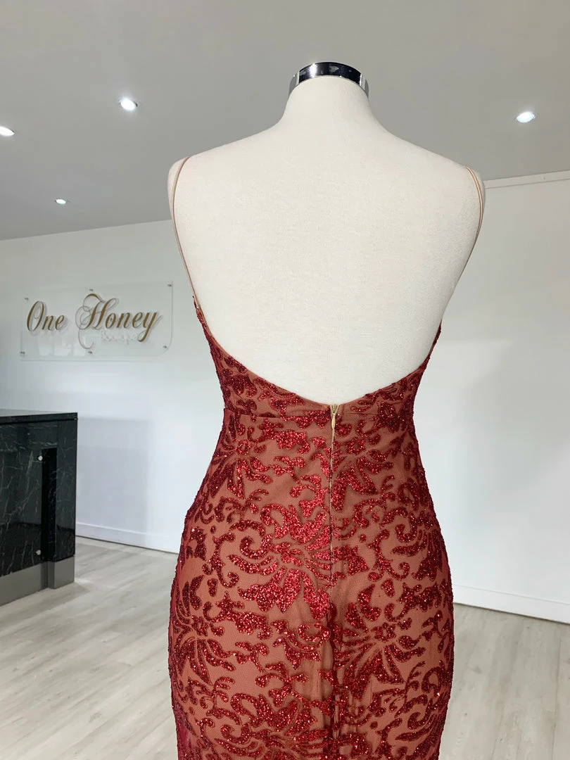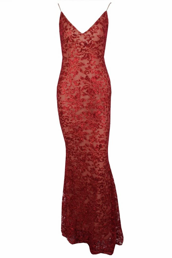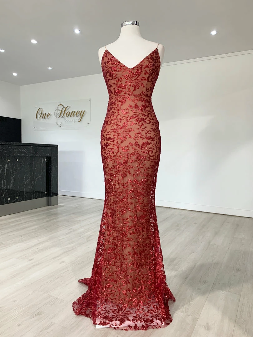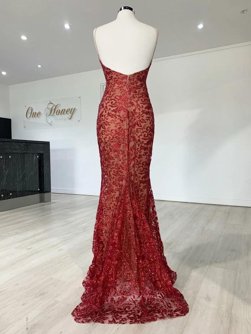 Make a statement in the GRETA Red Lace & Glitter Overlay Mermaid Formal Gown Dress from Honey Couture. This stunning gown has you set for any special occasion! Dress it up with some strappy heels, statement jewellery and a shiny clutch.