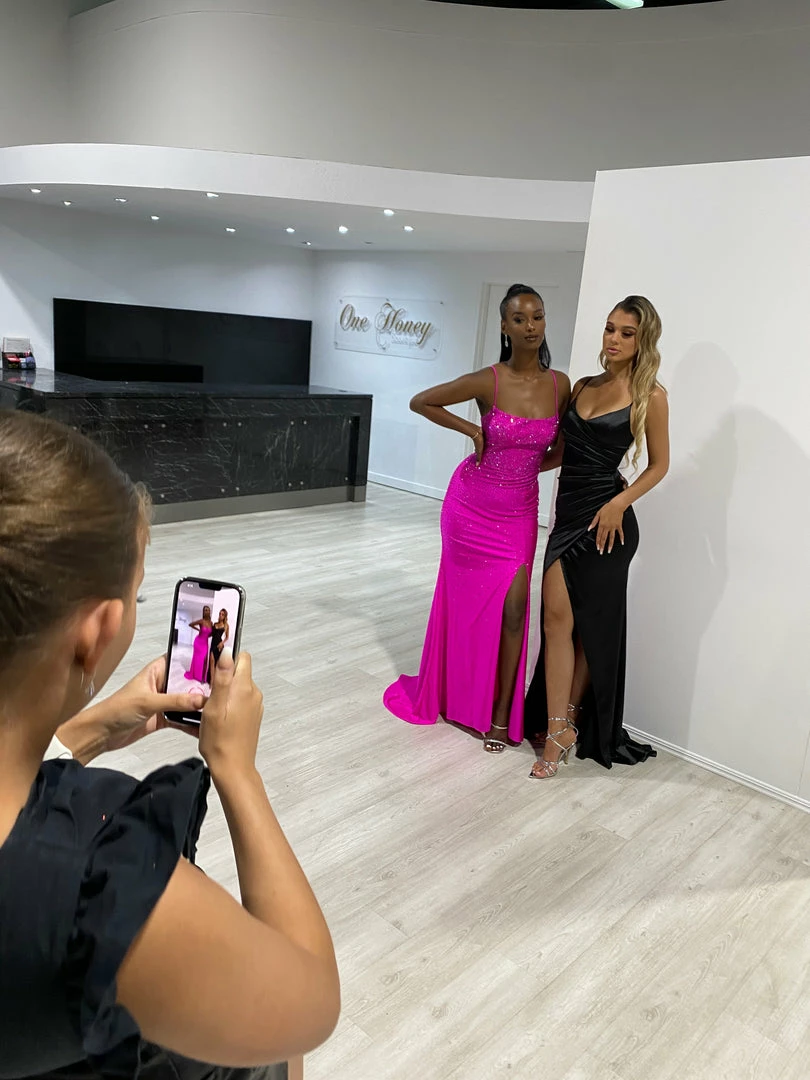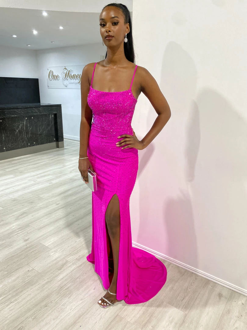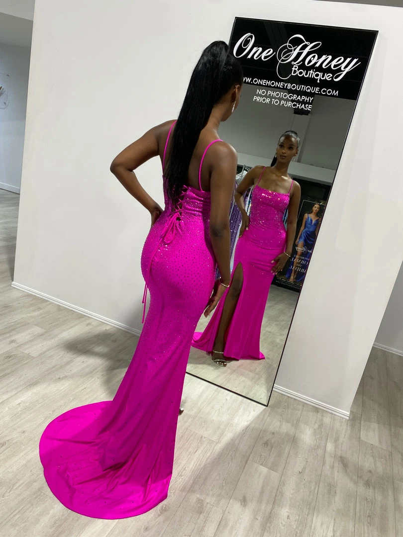 This gorgeous Honey Couture Honey Couture LEONIE Fuchsia Hot Pink Diamante Leg Split Mermaid Formal Dress is the most amazing Gown! Standout from the crowd in this show stopping design!