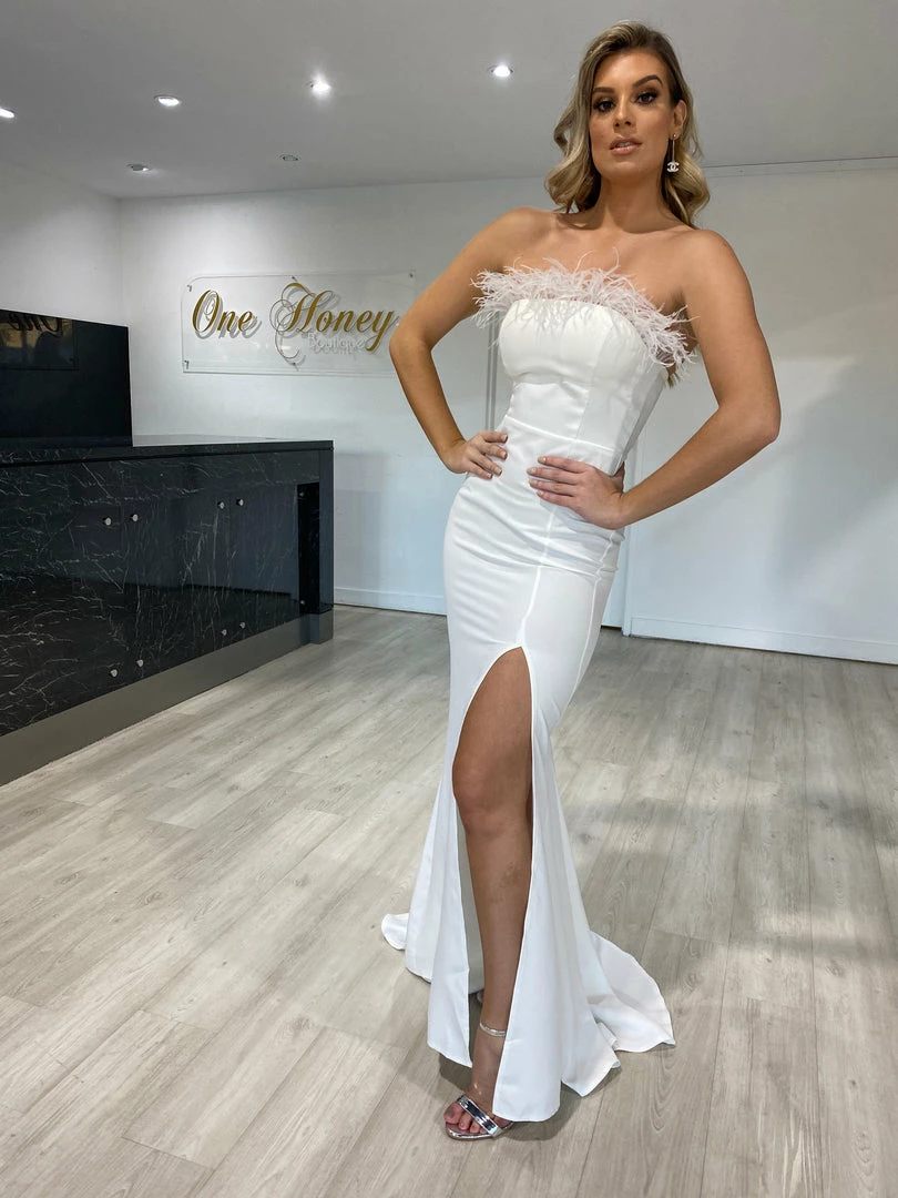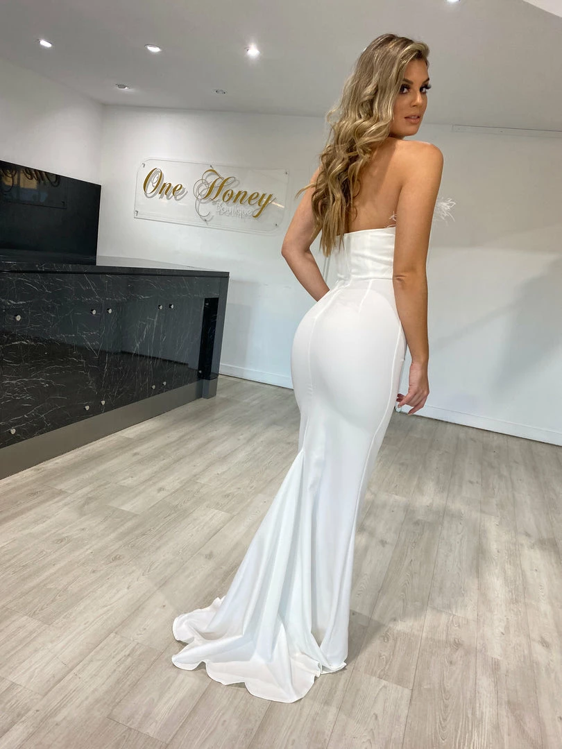 NEW ARRIVALS Honey Couture NARDIA White Feather Strapless Mermaid Evening Gown Dress