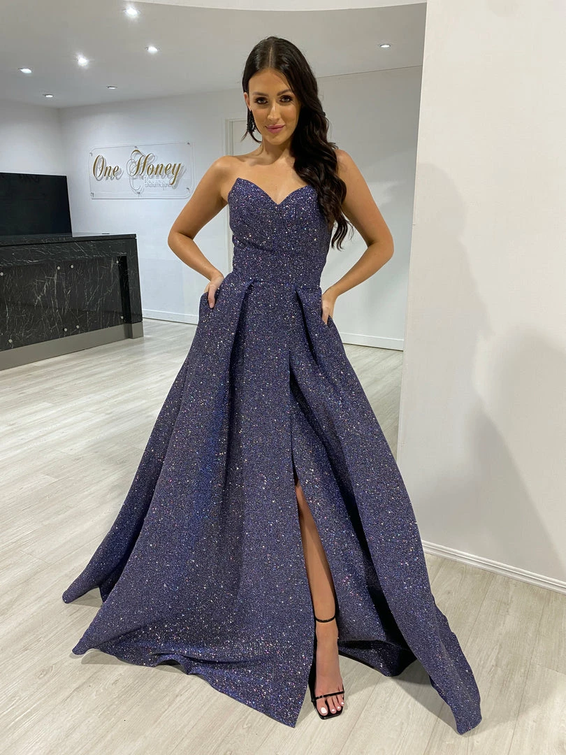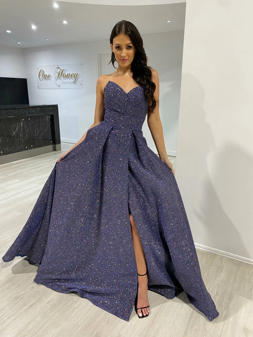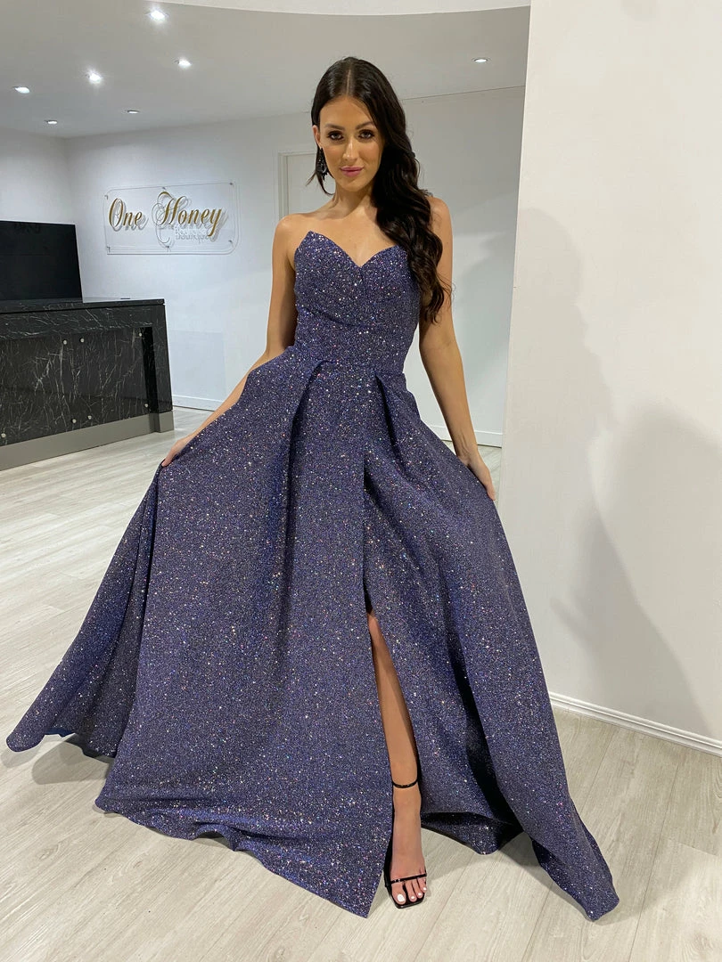 This gorgeous Honey Couture POLLY Blue Glitter Shimmer Strapless Ballgown Formal Dress is the most amazing Gown! Standout from the crowd in this show stopping design!