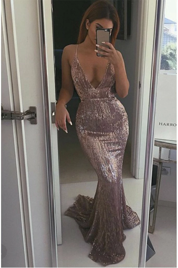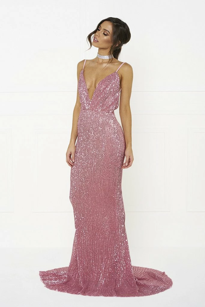 This glamorous formal gown features a mermaid train and low back. Pair with high heels and statement earrings and you are good to go!Â