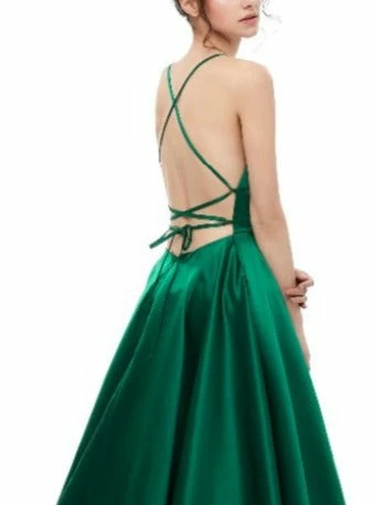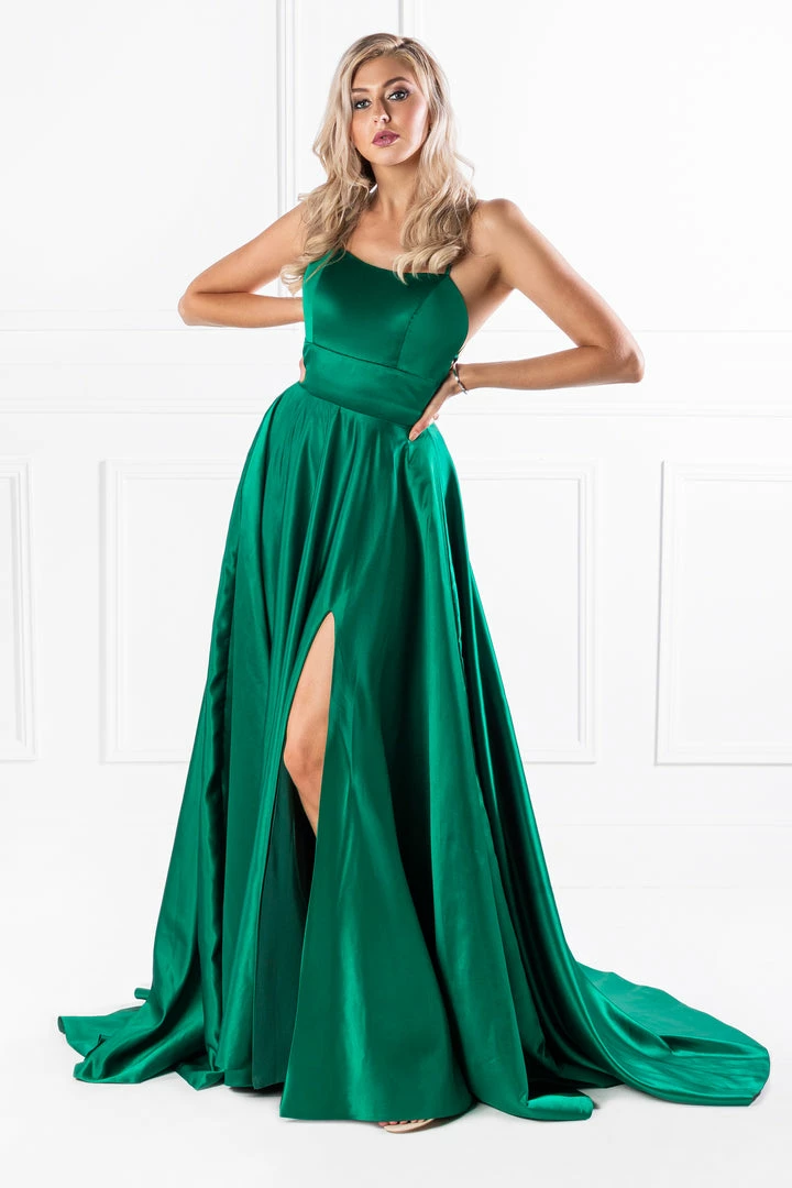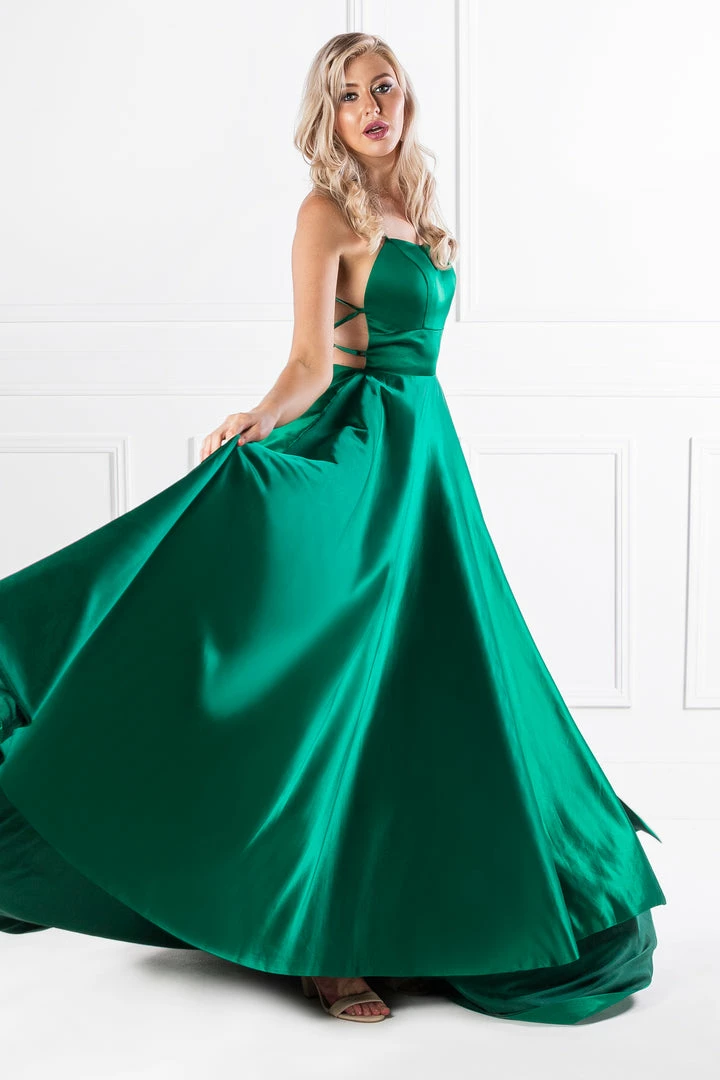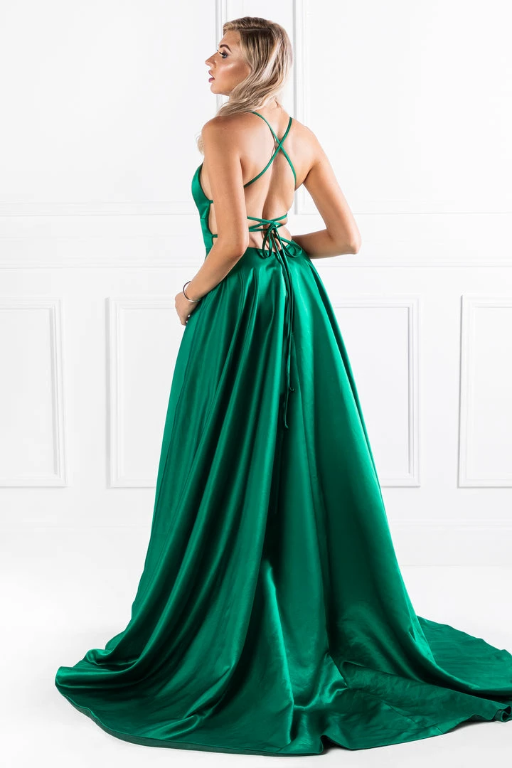 This gorgeous SHERRI Emerald Green Lace Up Back Satin Formal Gown is the perfect formal outfit. Pair with high heels and a smokey eye and you are good to go!Â
