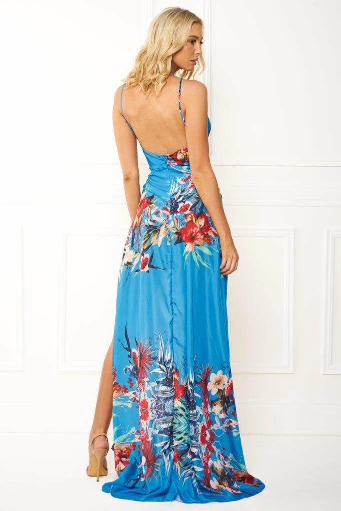 SHOP BY DRESS COLOUR Honey Couture CAMELIA Blue Floral Print Maxi Dress