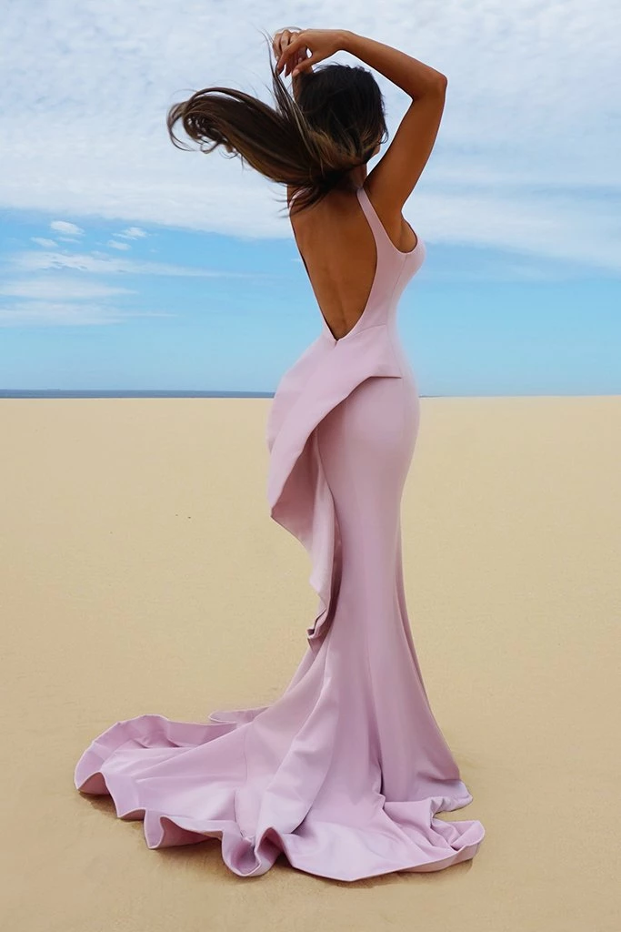 Gorgeous Crepe gown with frill layer down the back of the dress.
