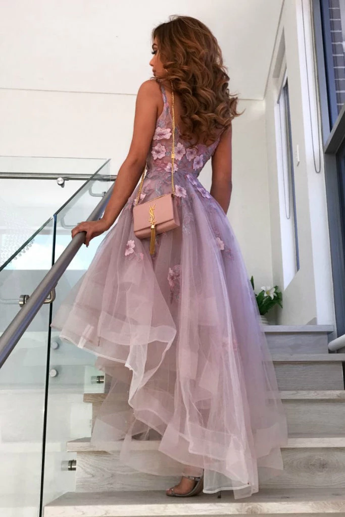 Right on trend this season – this beautiful sleeveless style gown with 3D flowers and high low hem is fitted to the waist with a gorgeous mesh skirt.